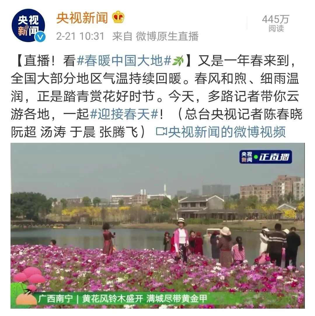 官方早在2月中下旬就已经做前宣,并且还在北京天安门地铁站《辉煌的中国》主题展播中滚动播放青秀山黄花风铃木现场画面。