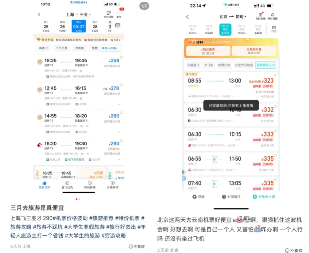 机票降价,有错峰游的打算吗?准备去哪里?评论区来讨论~(来源:嗨南宁综合OTA平台、网友评论等)