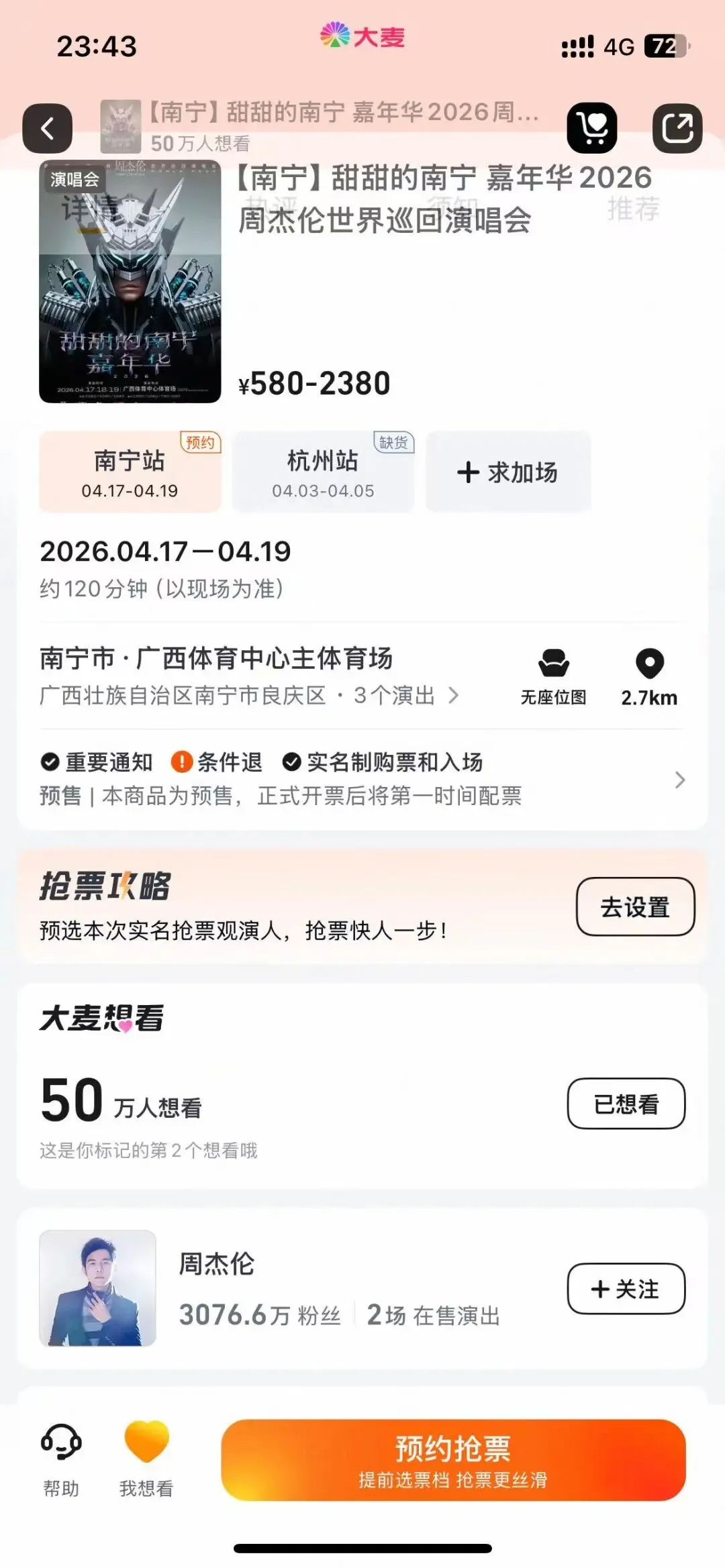 周杰伦「嘉年华II」世界巡回演唱会第二站正式落定南宁。2026年4月17日至19日,广西体育中心主体育场,他将带着全新主题「甜甜的南宁」,连唱三场,目前开启预约啦!巧的是,演唱会恰逢2026年广西三月三假期。
