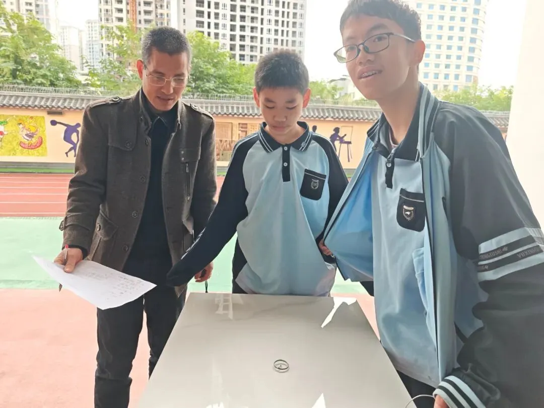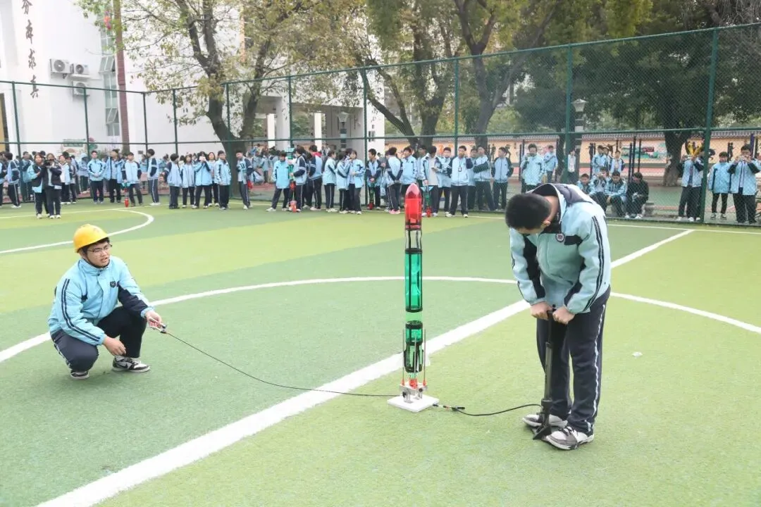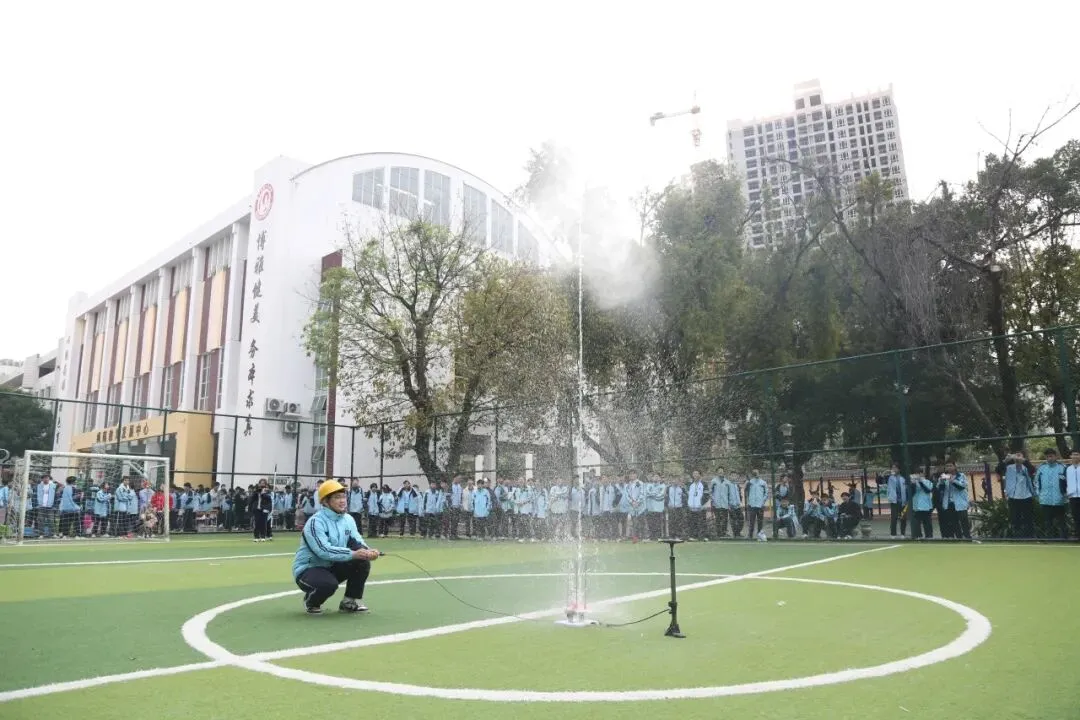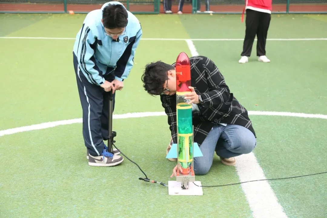 开幕式一结束,各类科技活动便火热开展,校园瞬间变身充满活力的“科技乐园”。操场专属飞行区域内,手掷滑翔机直线距离飞行、橡皮筋动力滑翔机留空竞时两项表演轮番登场。表演学生们凝神聚力,精准抛出或释放滑翔机,一架架造型精巧的滑翔机迎着微风腾空而起,在天空中划出优美弧线,引得现场师生阵阵欢呼与喝彩。一旁的竞技赛场同样精彩不断,水火箭射高比赛中,选手们亲手打造的水火箭呼啸升空,直冲云霄;铁丝陀螺比赛里,参赛团队操控陀螺飞速旋转,比拼紧张激烈,每一个精准操作都彰显着团队的创意与默契,尽显科技魅力。