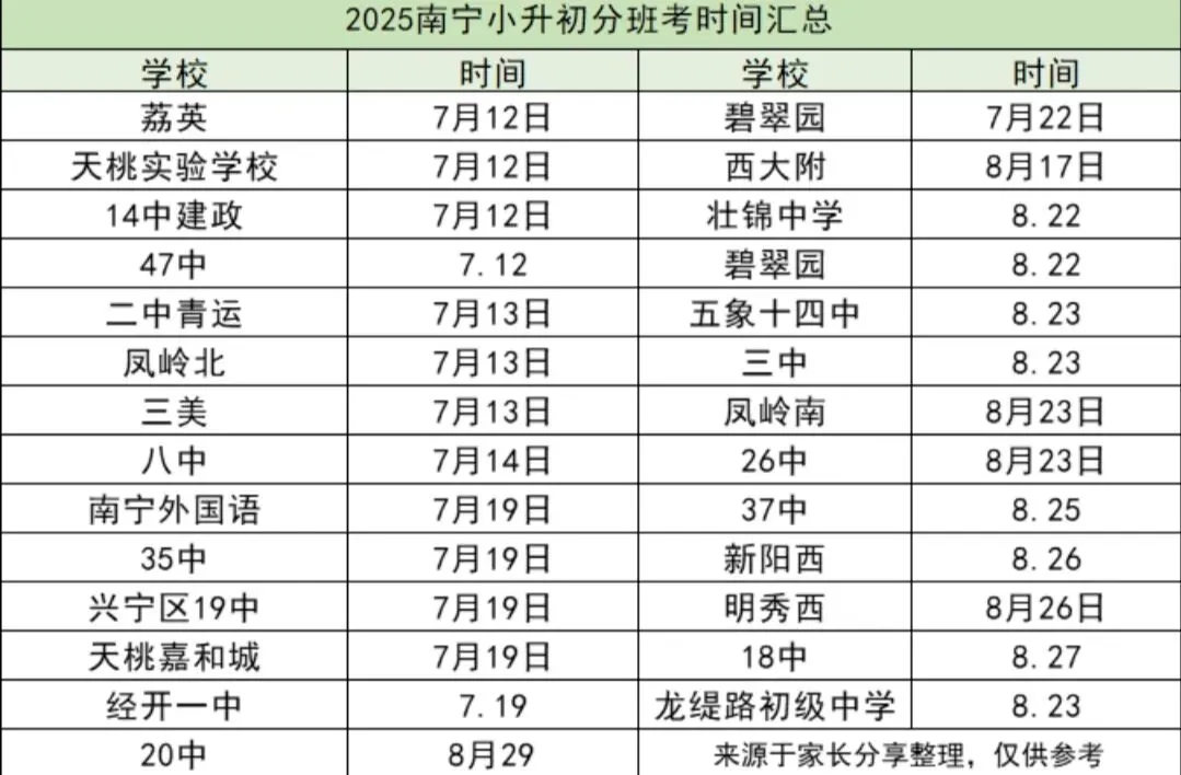 南宁历年小升初(新初一)分班考时间,进重点班,影响初中三年.