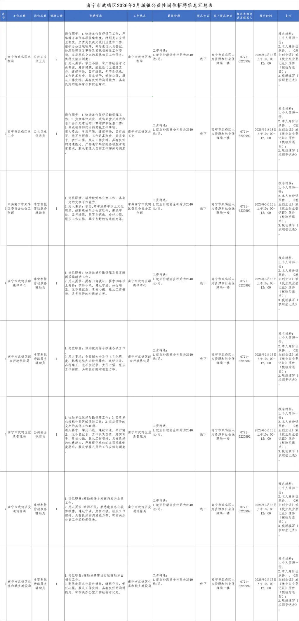 第一步:公开发布招聘岗位信息。人社部门每月向用人单位收集岗位信息并通过武鸣就业微信公众号等方式向社会公开发布公益性岗位信息及专场招聘会时间;