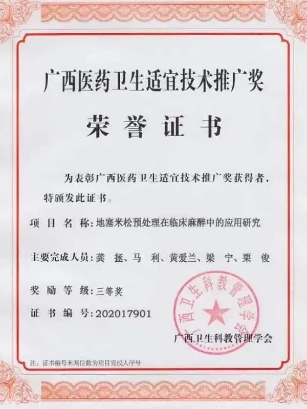 ◆《地塞米松预处理在临床麻醉中的应用研究》获2020年广西卫生事宜技术推广三等奖(第三完成人)。