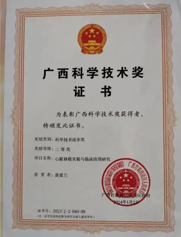 ◆《心脏移植实验与临床应用研究》,获2013年度广西医药卫生适宜技术推广一等奖、广西科学技术进步二等奖(第九完成人)。