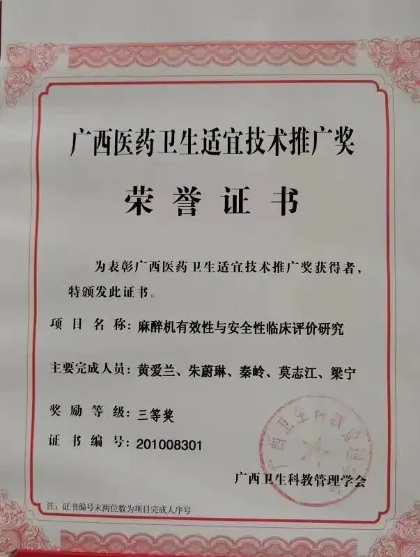 ◆《麻醉机有效性与安全性临床评价研究》获2010年广西医药卫生适宜技术推广三等奖(第一完成人)。