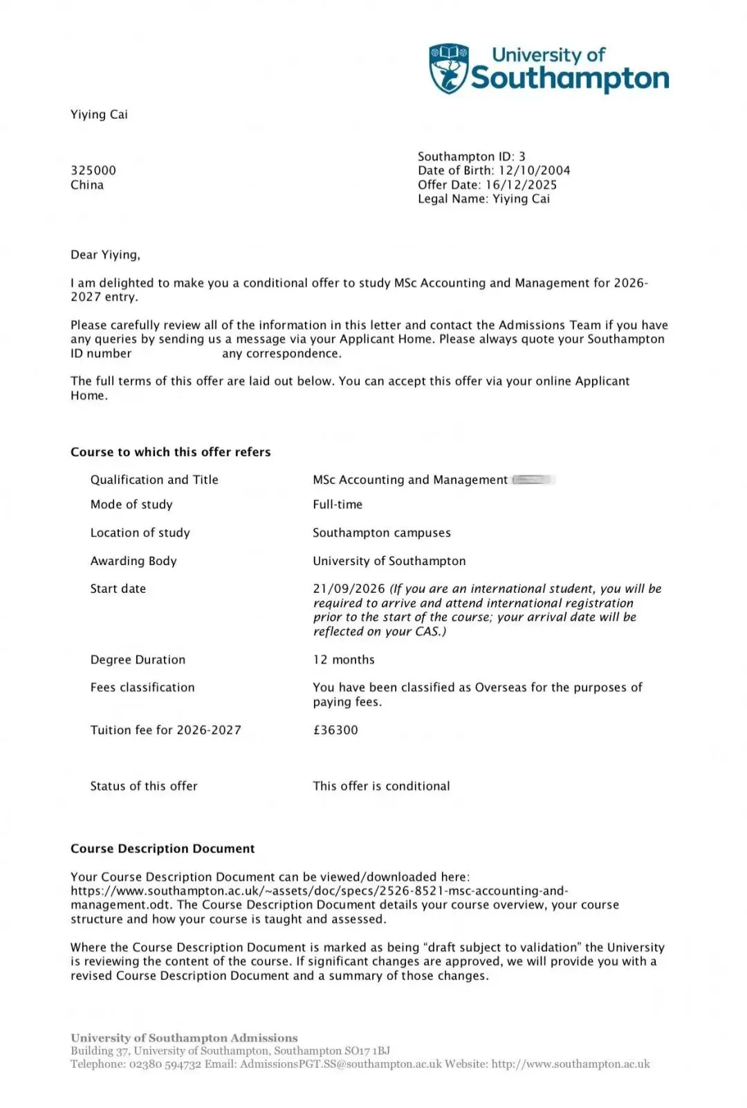 祝贺南宁理工学院商学院财务管理专业蔡依颖同学收获南安普顿大学(QS87)、谢菲尔德大学(QS92)offer。