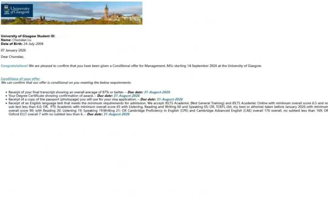 祝贺南宁理工学院商学院财务管理专业卢春晓同学收获格拉斯哥大学(QS79)offer。