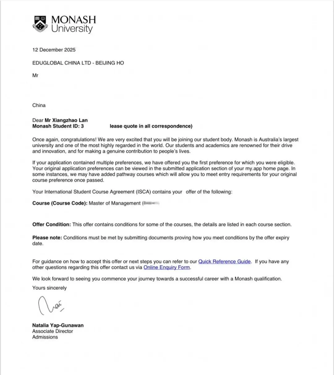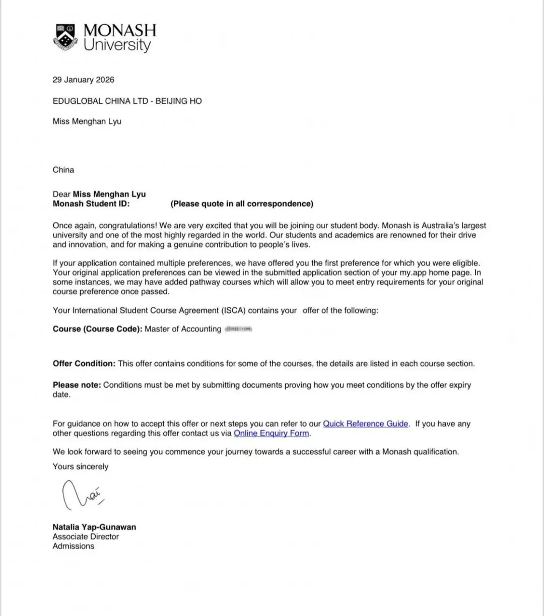 祝贺南宁理工学院商学院会计专业吕孟涵同学收获莫纳什大学(QS36)offer。