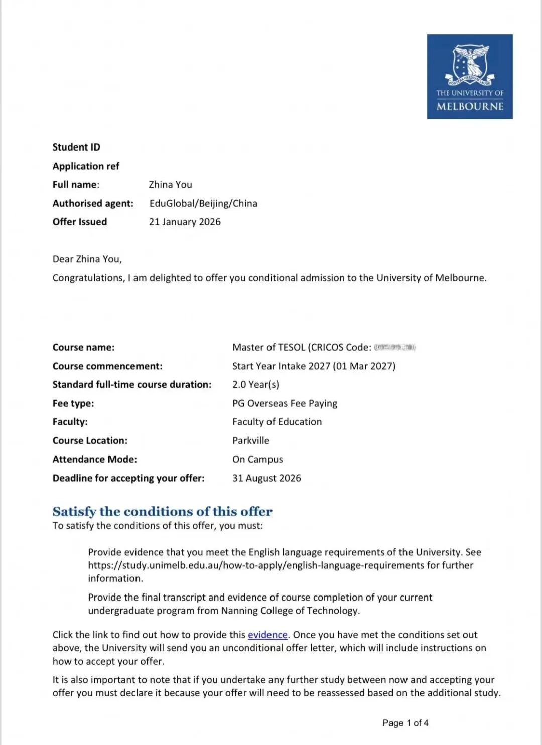 祝贺南宁理工学院文理学院汉语言文学专业游芷钠同学收获墨尔本大学(QS19)、悉尼大学(QS25)、昆士兰大学(QS42)offer。