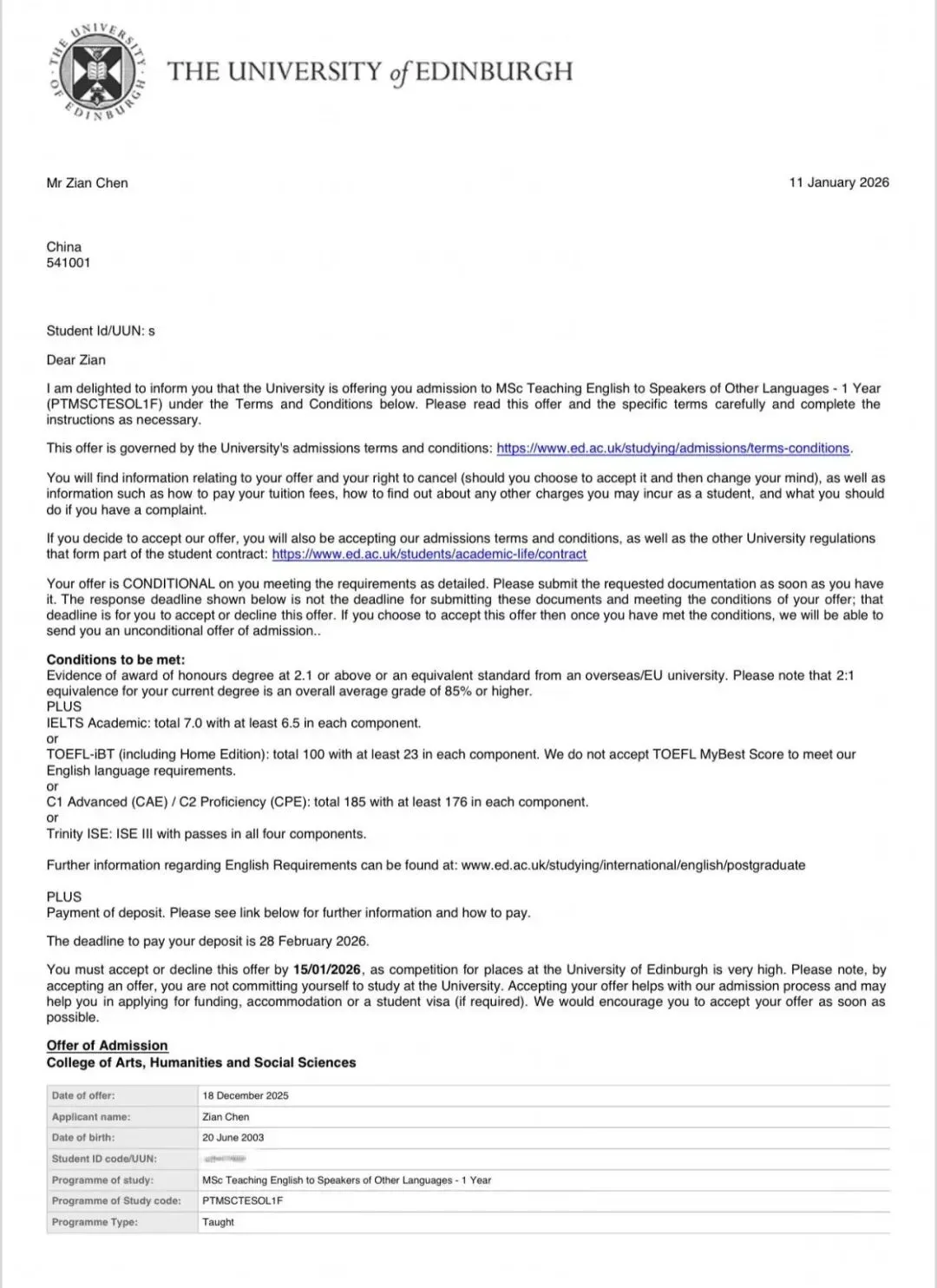 祝贺南宁理工学院文理学院英语专业陈子安同学收获爱丁堡大学(QS34)、利兹大学(QS86)、格拉斯哥大学(QS79)offer。