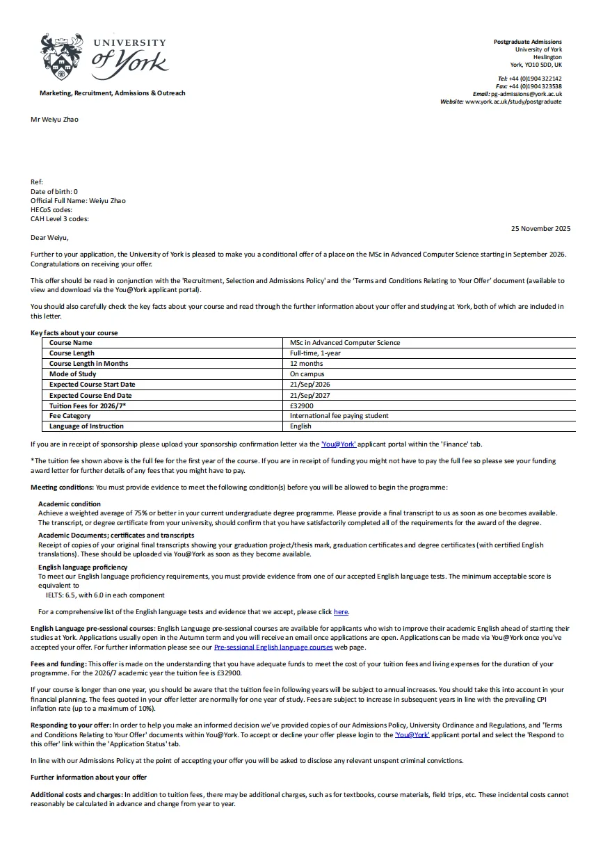 祝贺南宁理工学院信息工程学院计算机科学与技术专业赵卫宇同学收获约克大学(QS169)offer。