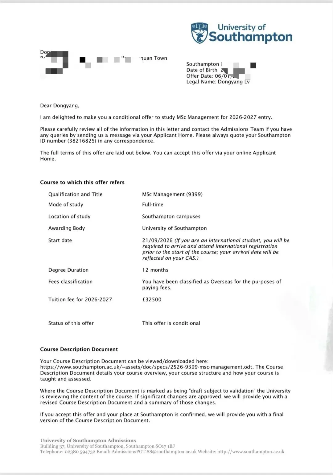 祝贺南宁理工学院土木与工程学院土木工程专业吕冬阳同学收获南安普顿大学(QS87)offer。