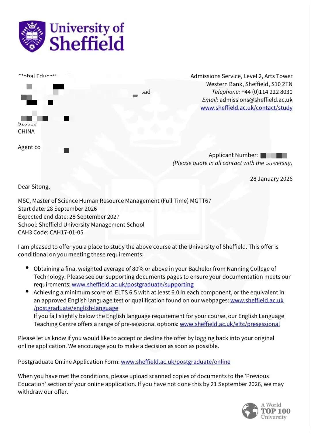 祝贺南宁理工学院艺术与传媒学院广播电视编导专业任思同同学收获谢菲尔德大学(QS92)offer。