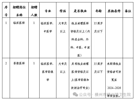 位要求:临床医师(大专及以上学历,临床医学、中医学专业),影像医师(大专及以上学历,临床医学、医学影像学专业)
