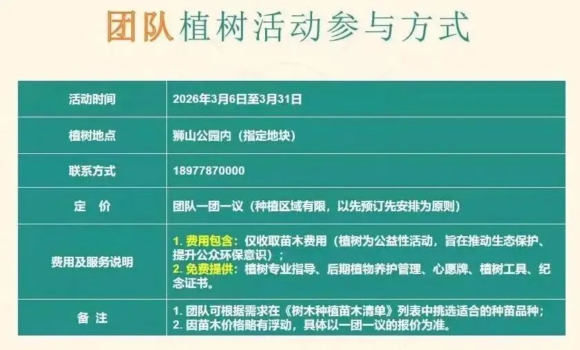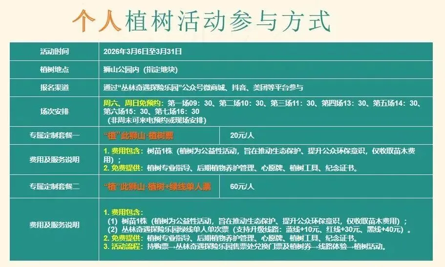 狮山公园&丛林奇遇探险乐园2026年互联网+全民义务植树月重磅开启,国家级植树基地专业植绿体验,搭配超有趣的丛林探险玩法,这个三月,种树撒欢两不误,解锁春日新玩法!研学热线:18977870000。