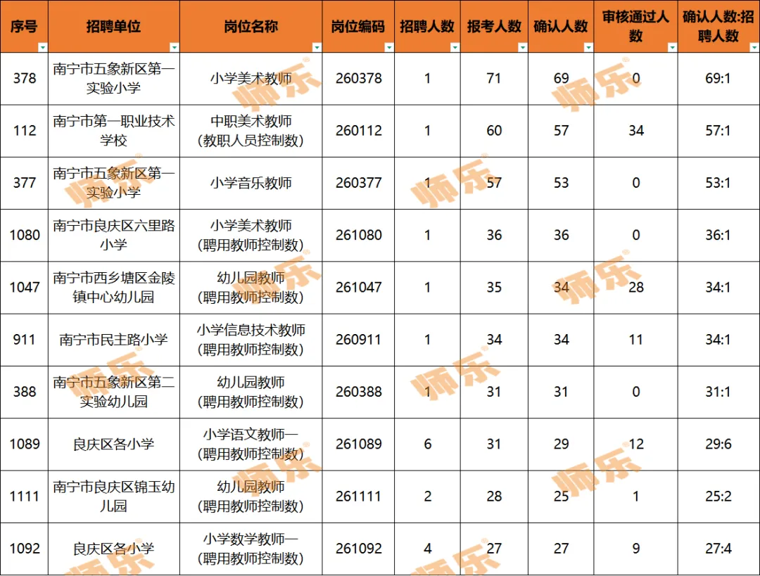 ①南宁市五象新区第一实验小学,小学美术教师(聘用教师控制数),招1人,当前报考人数71人;