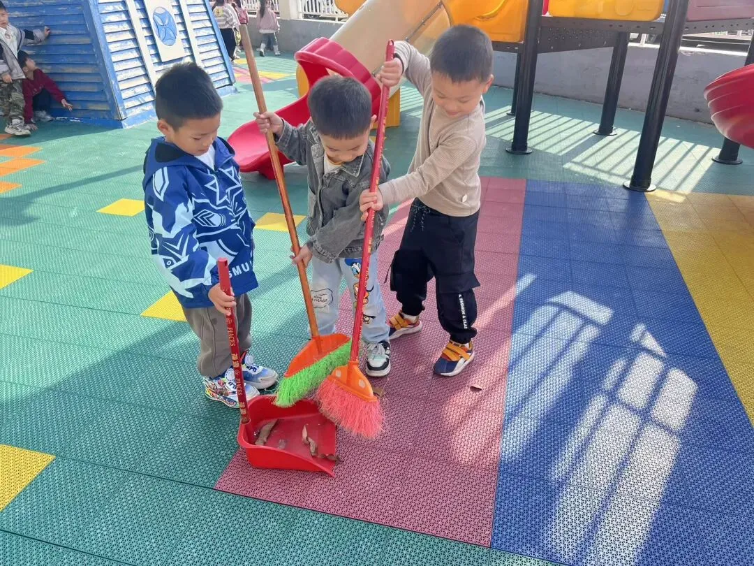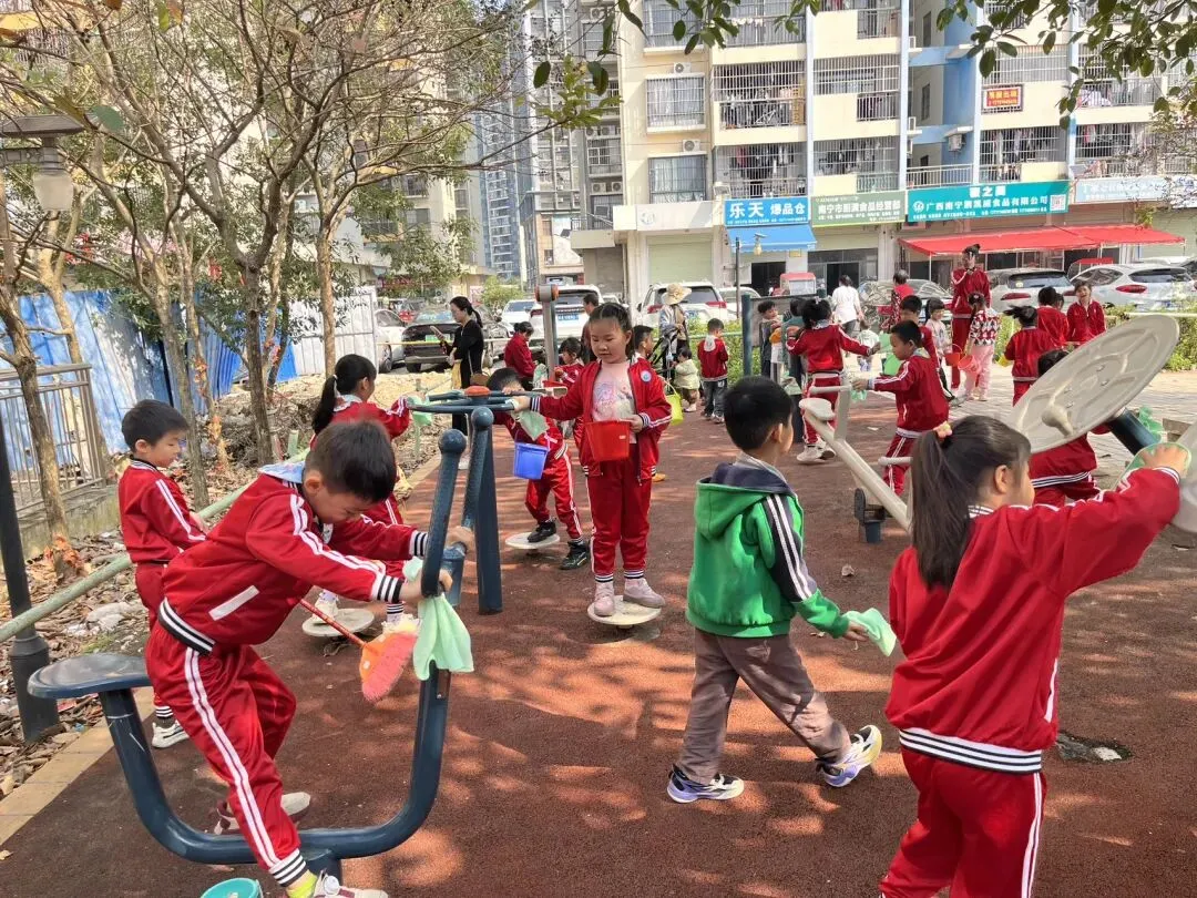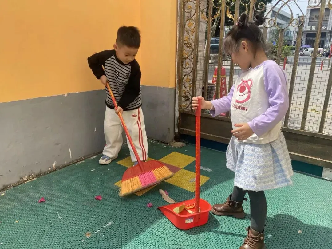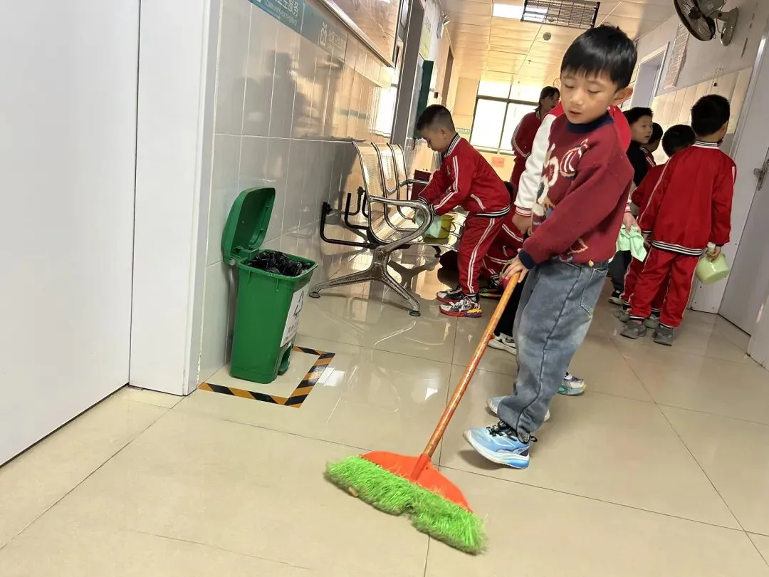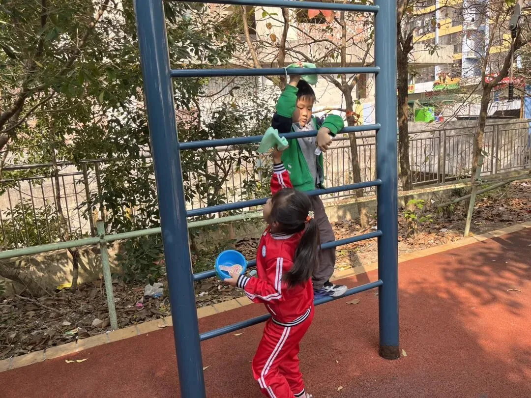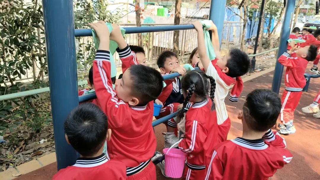 在幼儿园小宝贝们化身“小小清洁员”,他们小拿起抹布、小水桶、扫把,兴致勃勃地投入到志愿打扫活动中。“你擦攀爬架上面,我来擦下面!”“水脏了,我去换一盆!”……每个人都忙得不亦乐乎,将幼儿园打扫得一尘不染。