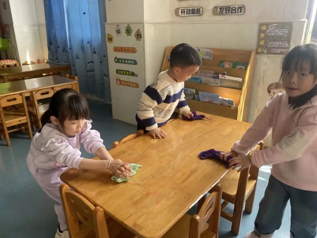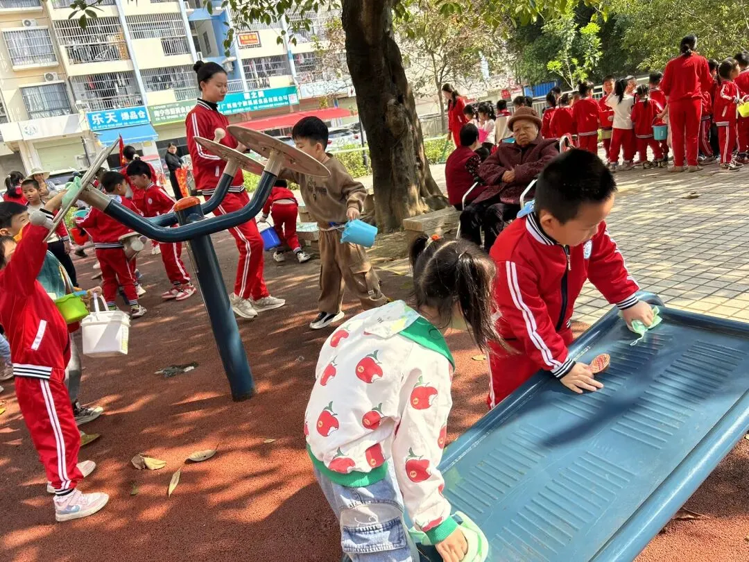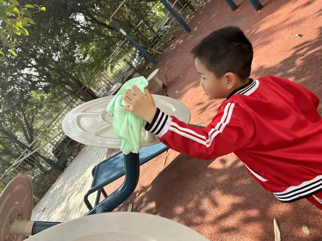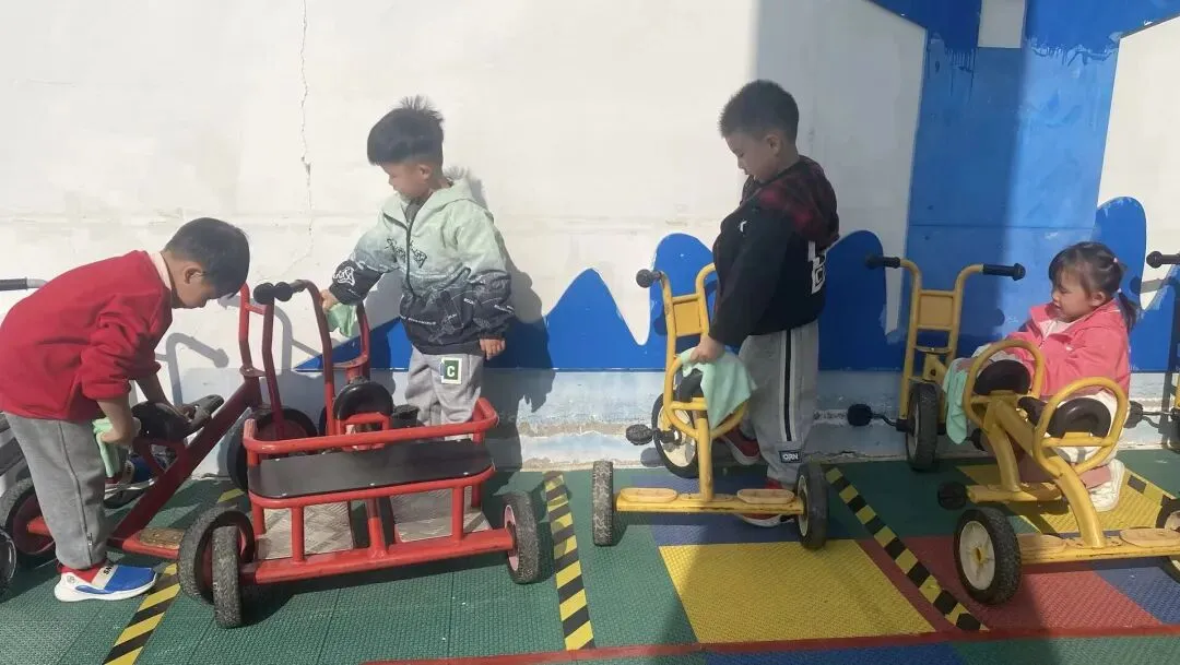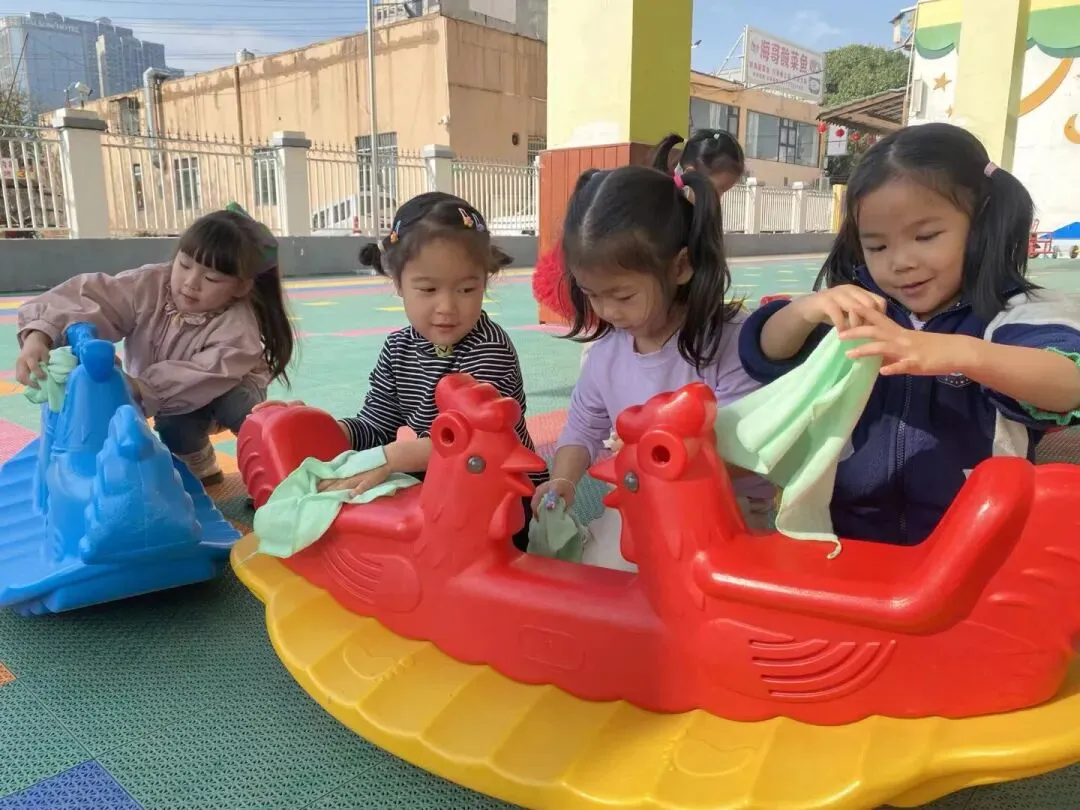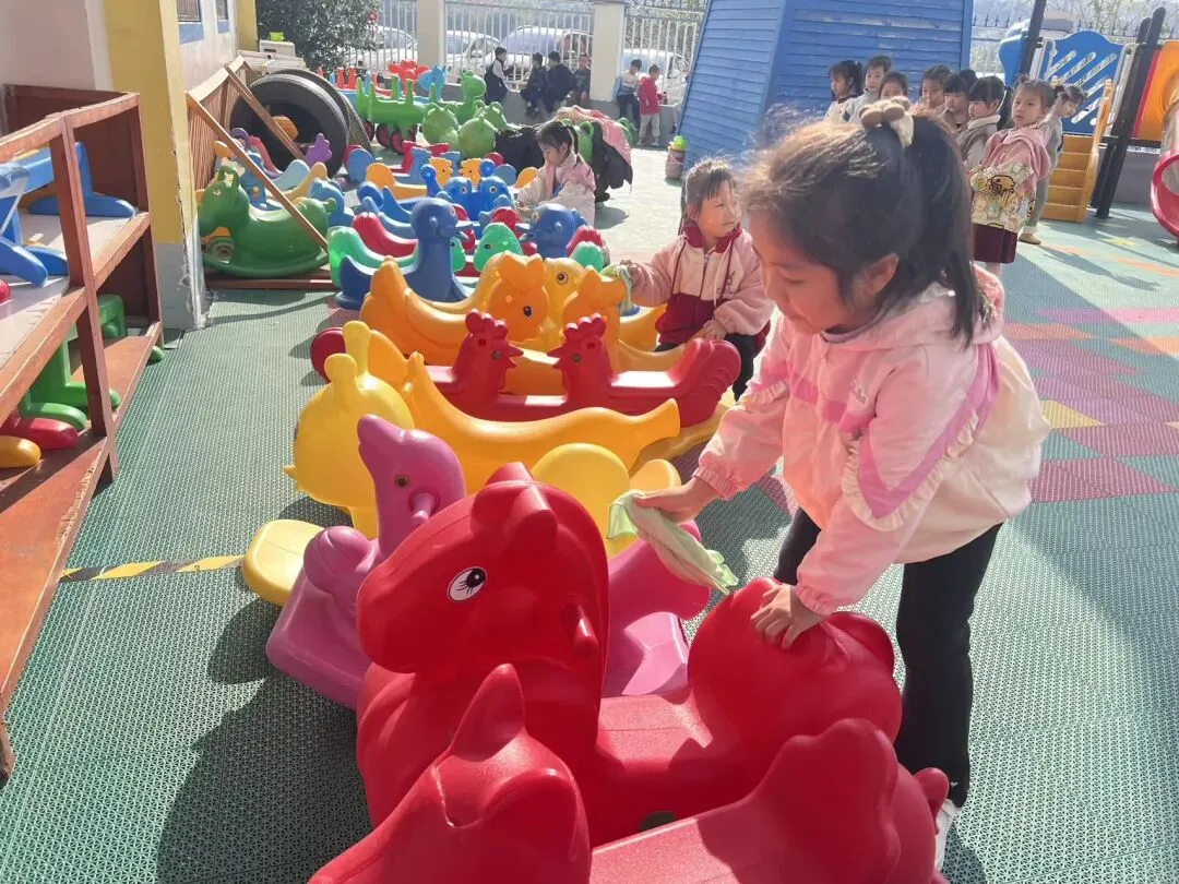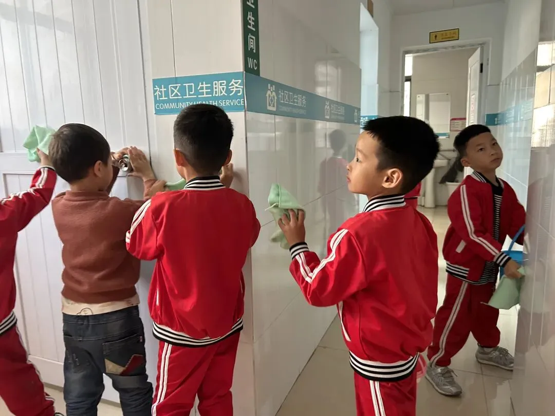 在幼儿园小宝贝们化身“小小清洁员”,他们小拿起抹布、小水桶、扫把,兴致勃勃地投入到志愿打扫活动中。“你擦攀爬架上面,我来擦下面!”“水脏了,我去换一盆!”……每个人都忙得不亦乐乎,将幼儿园打扫得一尘不染。