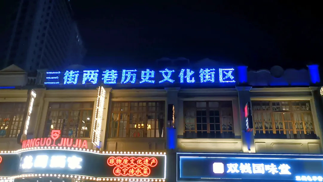 南宁的晚上,从地铁1号线朝阳广场站F口出来,穿过车水马龙的民族大道,转角就撞进了三街两巷的时光里。青砖黛瓦的骑楼顺着街道铺开,柱廊下的招牌轻轻晃动,瞬间把城市的喧嚣隔在了身后。刚踏上青石板路,就觉出脚下的温润——凹凸不平的石面被岁月磨得发亮,缝隙里还藏着些许潮气,踩上去没有清脆的声响,反倒带着一种踏实的厚重感。