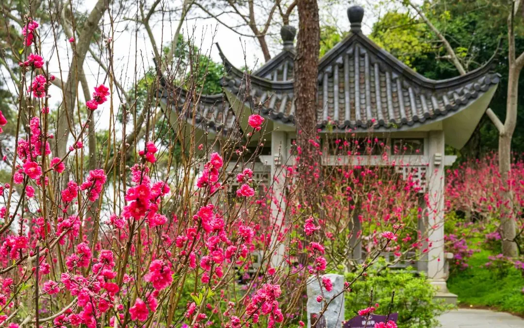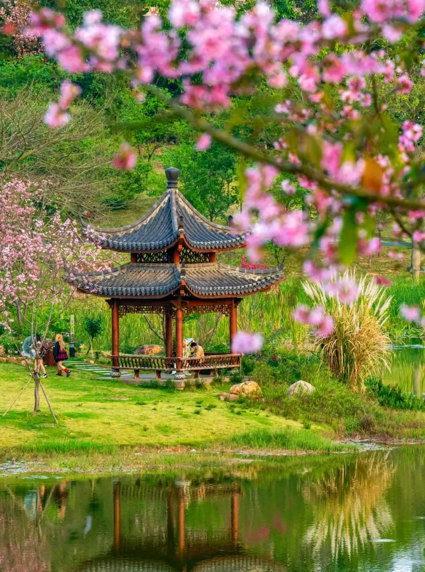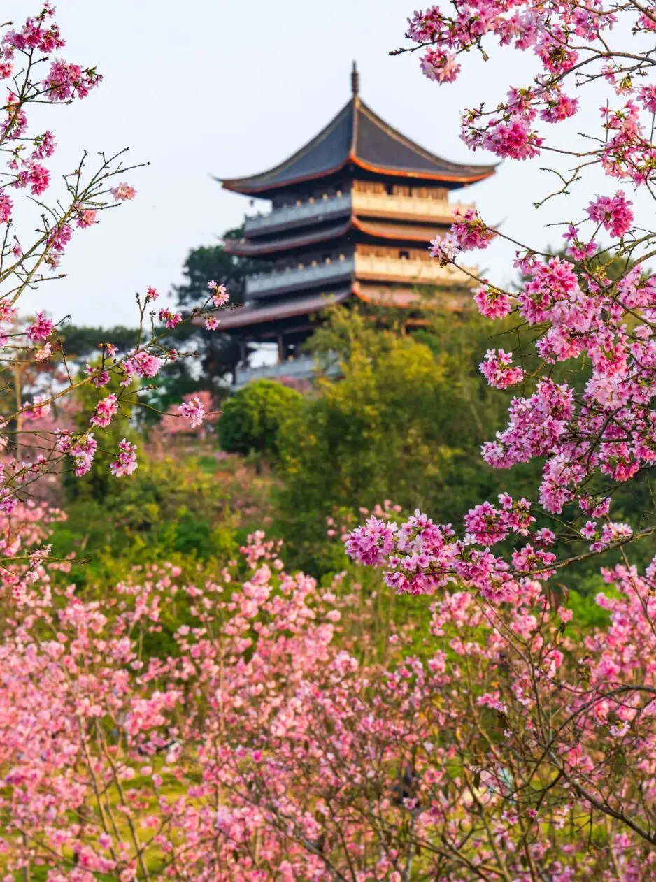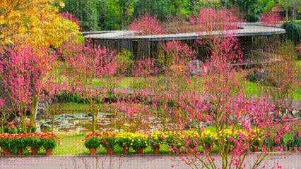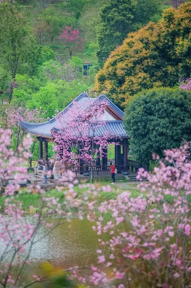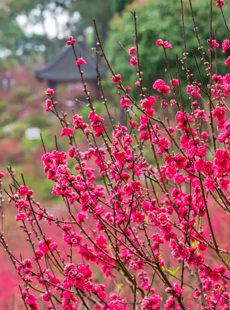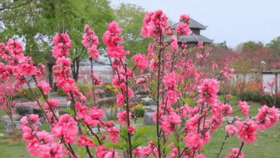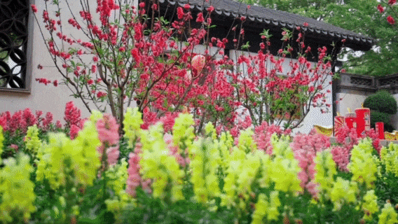 千枝绽粉,万朵流丹将春日园景渲染得灿若云霞