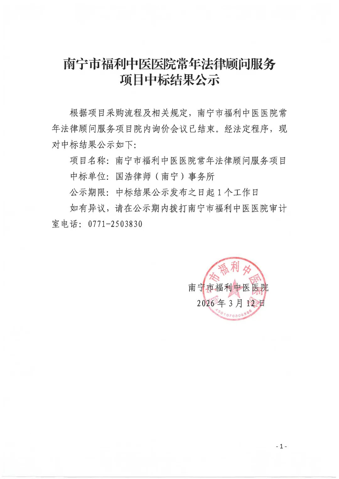 >南宁市福利中医医院常年法律顾问服务项目院内询价中标结果公示