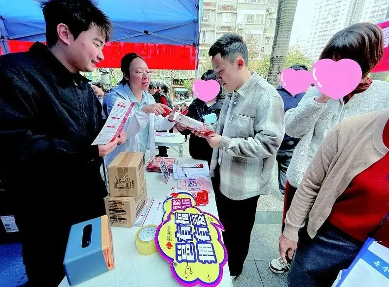 3月5日,在金洲社区学雷锋志愿服务活动现场,南宁福彩党员干部向市民讲解福彩公益金在养老服务、困境帮扶、社区建设等领域的使用成果。