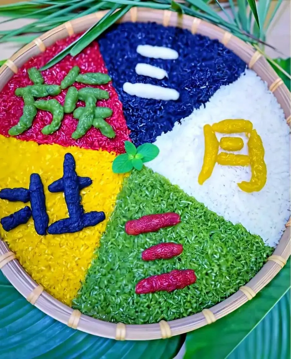 三月三・五色糯米饭是壮乡最具代表性的药食同源美食,用壮药汁液染色:枫叶(祛风除湿、舒筋活络)染黑色、红蓝草(活血解毒)染红色、黄栀子(清热利湿)染黄色、紫番藤(健脾养胃)染紫色。