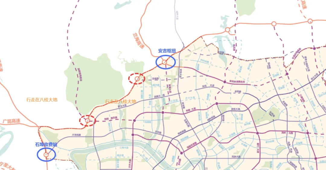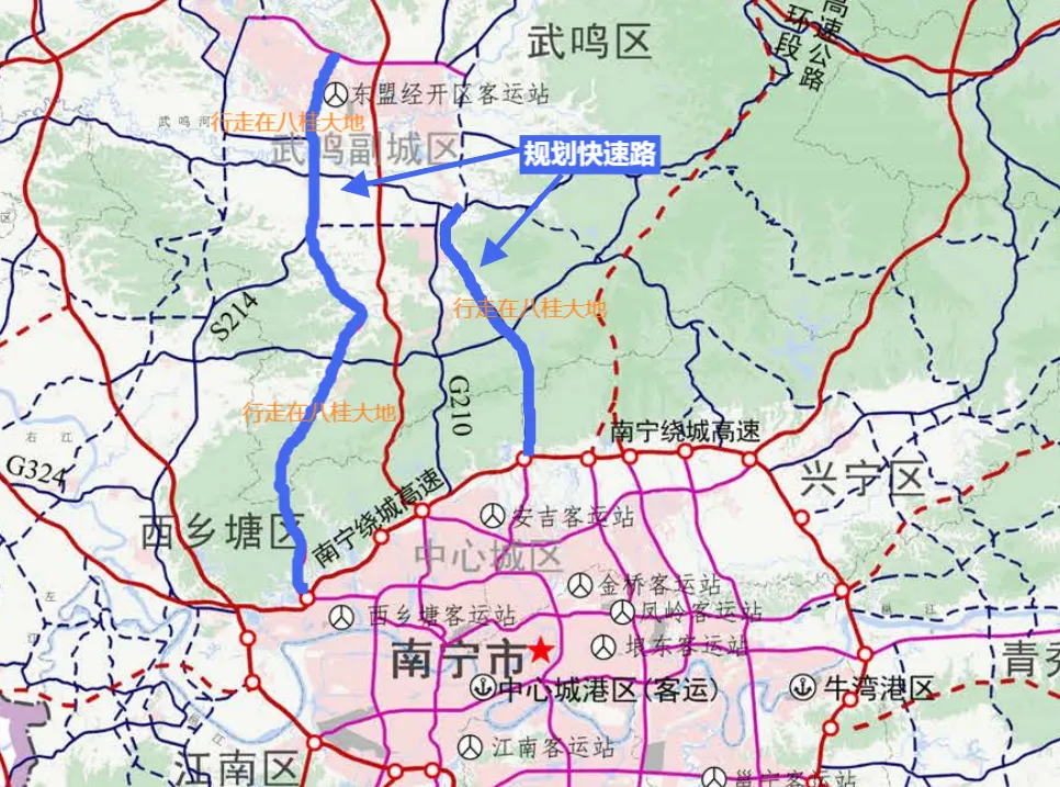 根据现有广西相关交通规划,从各个方向接入南宁的高速公路多达15条,截至目前已经建成了11条,剩余4个项目正在全力推进,有望在“十五五”期间建成通车。在这其中,也有部分“出城高速”进行了改扩建,如G72泉南高速和G75兰海高速等相关路段改扩建完成后,再加上琅东收费站取消、南宁东收费站的投用,南宁东向出城基本就告别了堵车问题。目前,南宁各个出城方向当中,“北向”出城是最为拥堵的,也就是安吉大道—G75兰海高速/南武大道往武鸣方向的路线。其中,南武大道是南宁市区往武鸣城区最主要的城市道路,为双向4车道标准,多为混凝土路面。既有G75兰海高速(都安-武鸣-南宁段)全长约139.95公里,双向4车道、时速100公里(部分路段限速80km/h),安吉至三岸段在2003年12月建成通车,都安至安吉段在2004年9月建成通车。这个出城方向不仅是最堵的,还被戏称为“最烂”出城高速。因为既有G75兰海高速(武鸣至南宁段)还是水泥路面,是南宁所有“出城高速”当中唯一的“水泥路面”高速,即使尚未建成的4条“出城高速”,也是采用沥青混凝土路面。此外,G75兰海高速和南武大道都直接汇入安吉大道,且在西津路-G75兰海高速出口与安吉大道交汇的十字路口还设置了红绿灯,使得进出城的车流容易在此汇集,再加上大货车较多等原因,造成该区域“平时小堵、节假日必定大堵”!在此背景下,G75兰海高速(武鸣至南宁段)改扩建就提上了日程。据悉,项目已经纳入《广西高速公路网规划(2018-2030年)》,同时也作为储备项目纳入了《广西综合交通运输发展“十四五”规划》,虽然已经开展前期各项研究工作,但还未见具体的开竣工时间表,也就是在短期内肯定是难以开工建设。在此情况下,南宁北向出城如何强化通行能力、缓解堵车问题?除了对既有道路进行扩容之外,还可以建设新线的方式提升通行能力,也可以增加高速“出入口”,分流安吉收费站的车流。随着“十四五”的结束、“十五五”的到来,各地都会出台“十五五”相关规划,甚至是更长时间段的规划,交通领域专项规划也会陆续出炉。近期,南宁市发布了最新的相关交通规划,如《南宁市综合交通规划(2025-2035)》、《南宁市路网专项规划》等等,明确未来交通建设的重点方向。从整体来看,南宁北向出城的主要车流整体分为3个部分:一是川渝黔往广西、海南的车流,二是南宁北部各县、河池部分县城往南宁方向的车流,三是武鸣城区往南宁市区的车流。所以,在南宁市相关交通规划里,不仅布局了新的北上高速公路,还布局了新的城市快速路,强化武鸣至南宁之间的交通能力。在高速公路方面,G7522贵阳至南宁段已经建成通车,为双向6车道的交通大动脉,可以分流G75兰海高速部分车流。此外,还计划在安吉收费站、石埠收费站之间新增1个高速“出入口”,可以分流经安吉收费站进出城的车流。在南宁市区往武鸣城区也规划了2条新的快速通道,位于G75兰海高速/南武大道东西两侧,其中,东侧的是既有邕武路“北延线”,也就是既有X307县道有望升级为快速路,可以成为南宁中心城区往武鸣的快速通道。在西侧,则是武鸣区至高新区快速路,这条通道拟按时速80公里的一级公路标准建设,已完成工可报告初稿编制等工作。另据2023年相关回复的信息显示,推荐方案线路约54.8公里,总投资约为42.48亿元,但预期收入不足以覆盖建设期及运营期成本,每年需要政府补助资金缺口,在财政困难和国家拟调整PPP项目政策等因素影响下,前期工作尚未取得关键突破。当然了,南宁规划的轨道交通武鸣线,若是时机成熟,能早日开工建设、早日建成通车,南宁市区与武鸣城区的交通联系将更加密切!