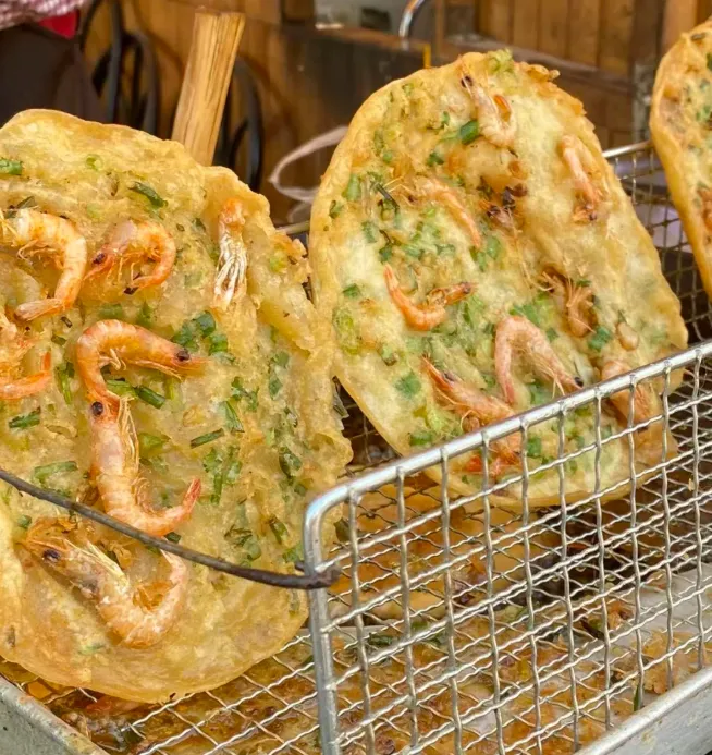 重点说说虾饼。这玩意儿看着粗糙,吃着精细。面糊裹着鲜活的小虾,入油锅炸到金黄酥脆。咬一口,不是满嘴面粉感,而是实实在在的虾肉弹牙,葱香和油香在嘴里炸开。趁热吃,烫嘴才香,凉了就泄了那股子鲜劲儿。几块钱一个,拿在手里边走边啃,油蹭到嘴边也不要在意。