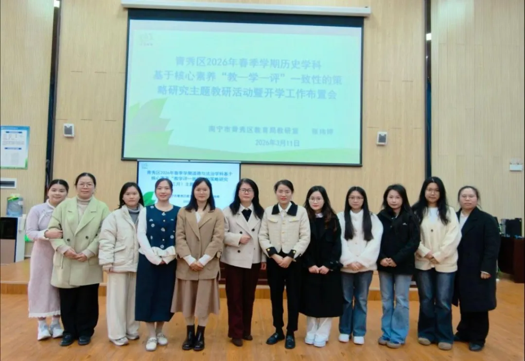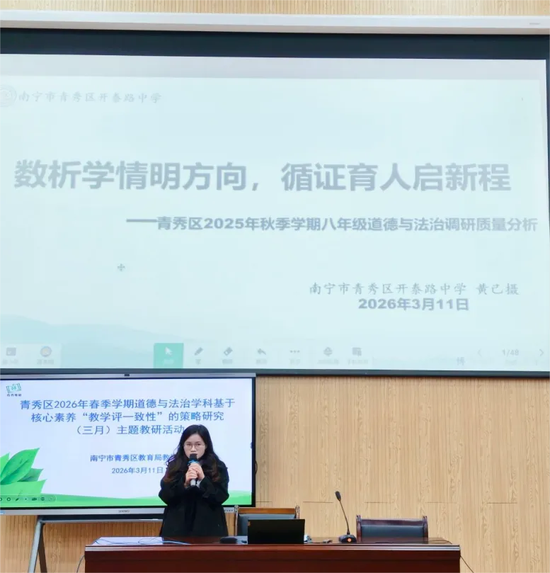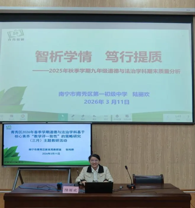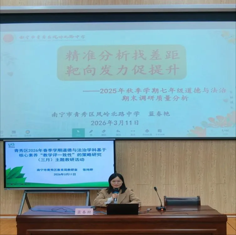 春启新程,研思致远。为深化核心素养下 “教学评一致性” 教学实践,2026年3 月 11 日上午,青秀区初中道德与法治学科三月主题教研活动于我校开展,青秀区道德与法治教师齐聚一堂,以质量分析明短板,共探学科提质之路。