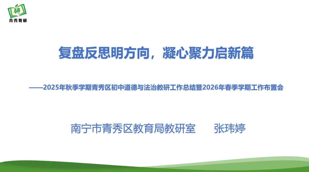 青秀区教育局教研室张玮婷老师全面复盘秋季学期全区道法教研工作,肯定各校教研亮点、客观剖析现存问题,同时围绕核心素养培育、“教学评一致性” 深化等关键,详细部署 2026年春季学期教研重点任务,明确学科发展目标与实施路径。张老师的总结高屋建瓴,既有对过往教研的温情复盘,更有对未来工作的清晰指引。相信在张老师的智慧引领下,我们定能凝聚育人合力,让道德与法治学科的素养之花在课堂上绚烂绽放!
