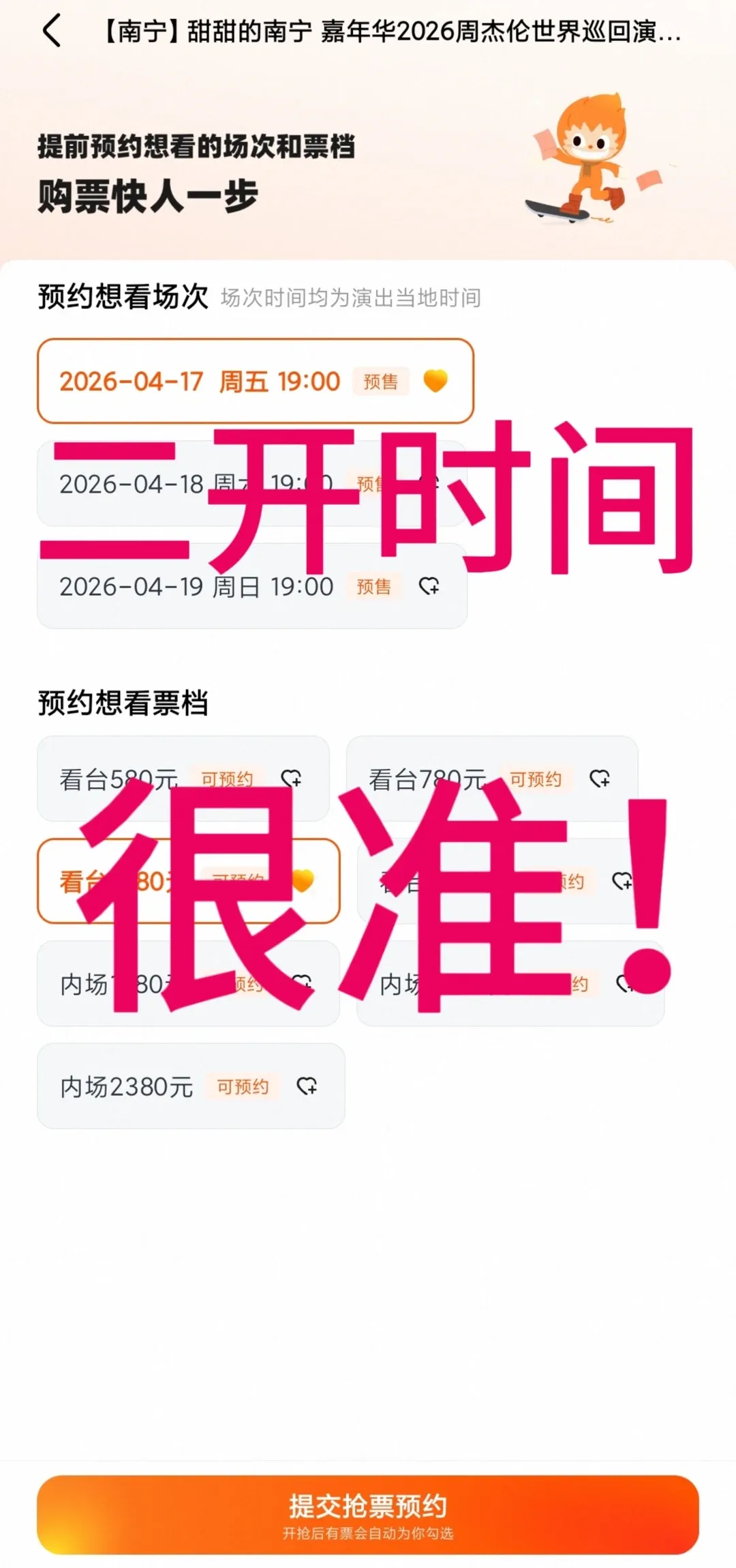 南宁周杰伦二开一定有的哦!还是三场一起开,建议大家首选26年4月19日 1080/1380 的!1380 的座位会增加一些,相对来说好抢一点。首开没抢到的宝子们莫灰心!还有一次机会!剩下的交给命运就好