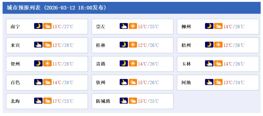 预计12日晚到13日白天,全区依旧维持多云到晴的天气。13日晚上到14日白天,全区多云到阴天为主,桂西北局地有小雨洒落。(详情>>)