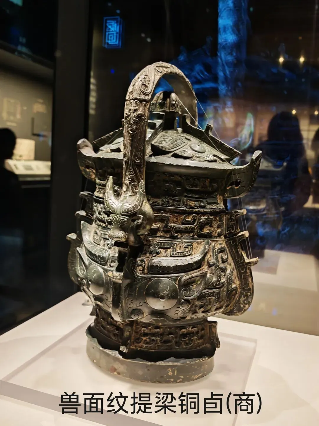 作为盛酒器的它周身布满饕餮纹、夔纹、蝉纹,提梁两端作牛头形,盖内有铭文。