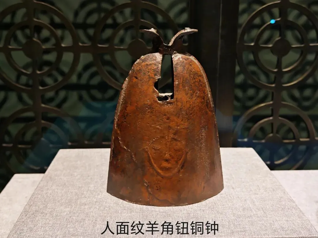 4.上有金乌,且九枝在下,一枝在上,与《山海经》所记扶桑树传说相吻合的“树形灯”。 5.张嘴嘶鸣,右前腿提起,作势要奔腾状态的“大铜马”。 马年将至,看到如此昂头竖耳,高大刚健的骏马,真是一年好兆头! 有两个应该是岭南特色与中华文明深度融合的产物: 6.以广西出土的数量最多,形制大致相同,极富地方特色的青铜打击乐器“羊角钮钟”。 这是个岭南越族竹筒状的器物,绘有楚文化风格的漆画,内容是汉代主流信仰的升仙思想。 从下至上四圈连环画,描绘了墓主人从人间出发,启程到天门,成功升入天国的全过程。