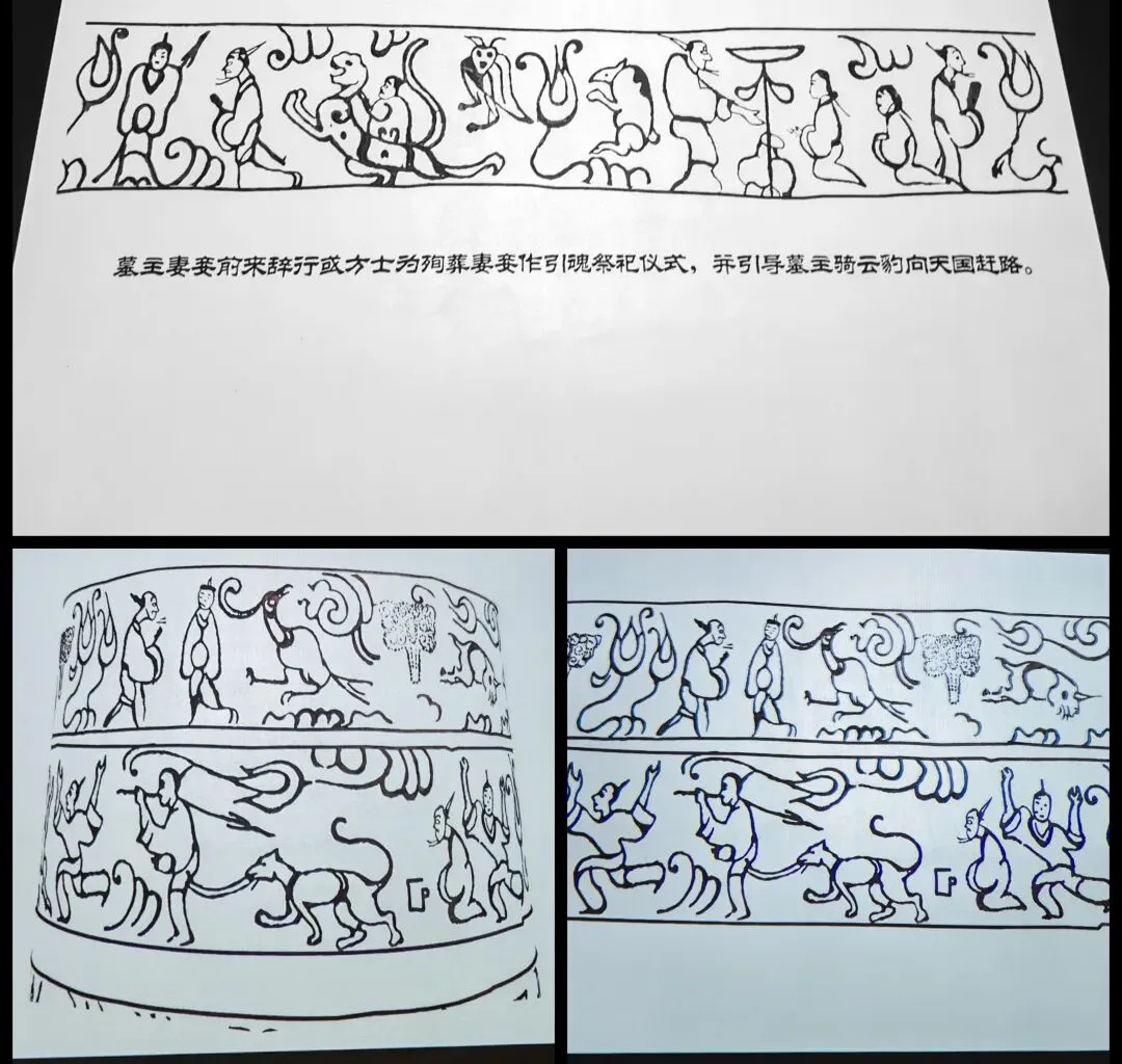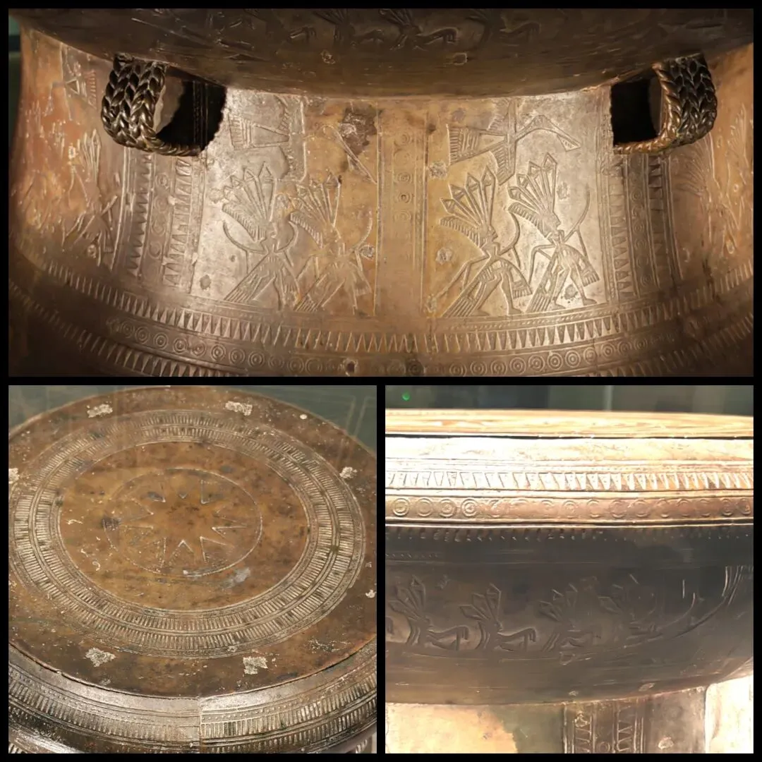 这是个鼓面有太阳,鼓胸有羽人划船,鼓腰有羽人舞蹈,还有衔鱼翔鹭等纹饰的“石寨山型铜鼓”。