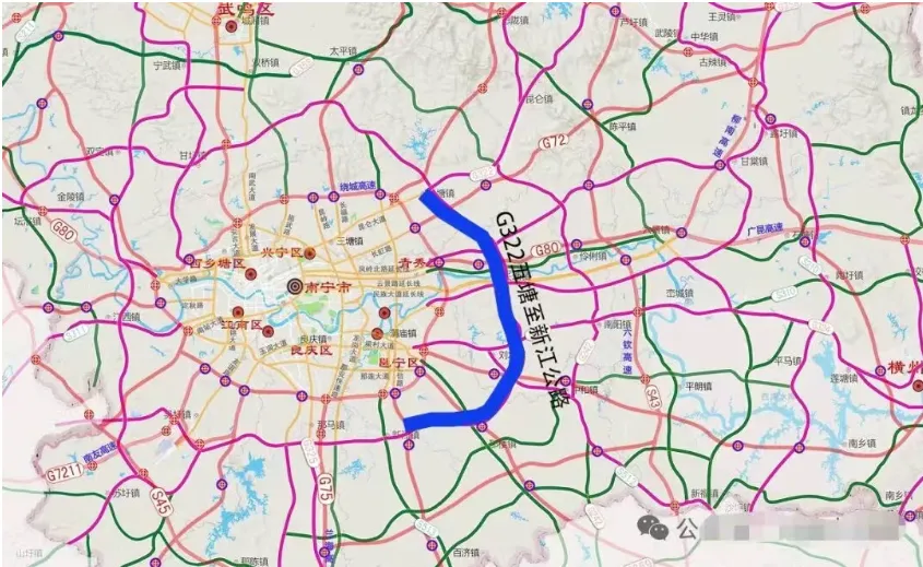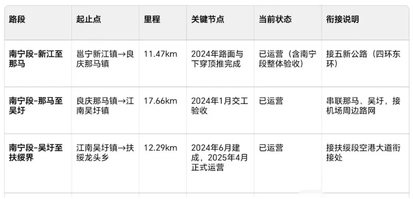 南宁段(约 47.66 公里):2025 年全线通车,串联五象、邕宁、良庆、经开区、空港经济区,联通崇左扶绥,PPP 项目 2025 年绩效得分 921.4 分扶绥段(12.3 公里):2025 年 6 月通车,双向四车道,时速 60-80 公里通行效率:邕宁新江→扶绥车程由 2 小时缩至约 30 分钟,后续将开通城际公交,实现扶绥→吴圩机场半小时公交化二、东环:G322 五塘 — 新江公路(建设中)