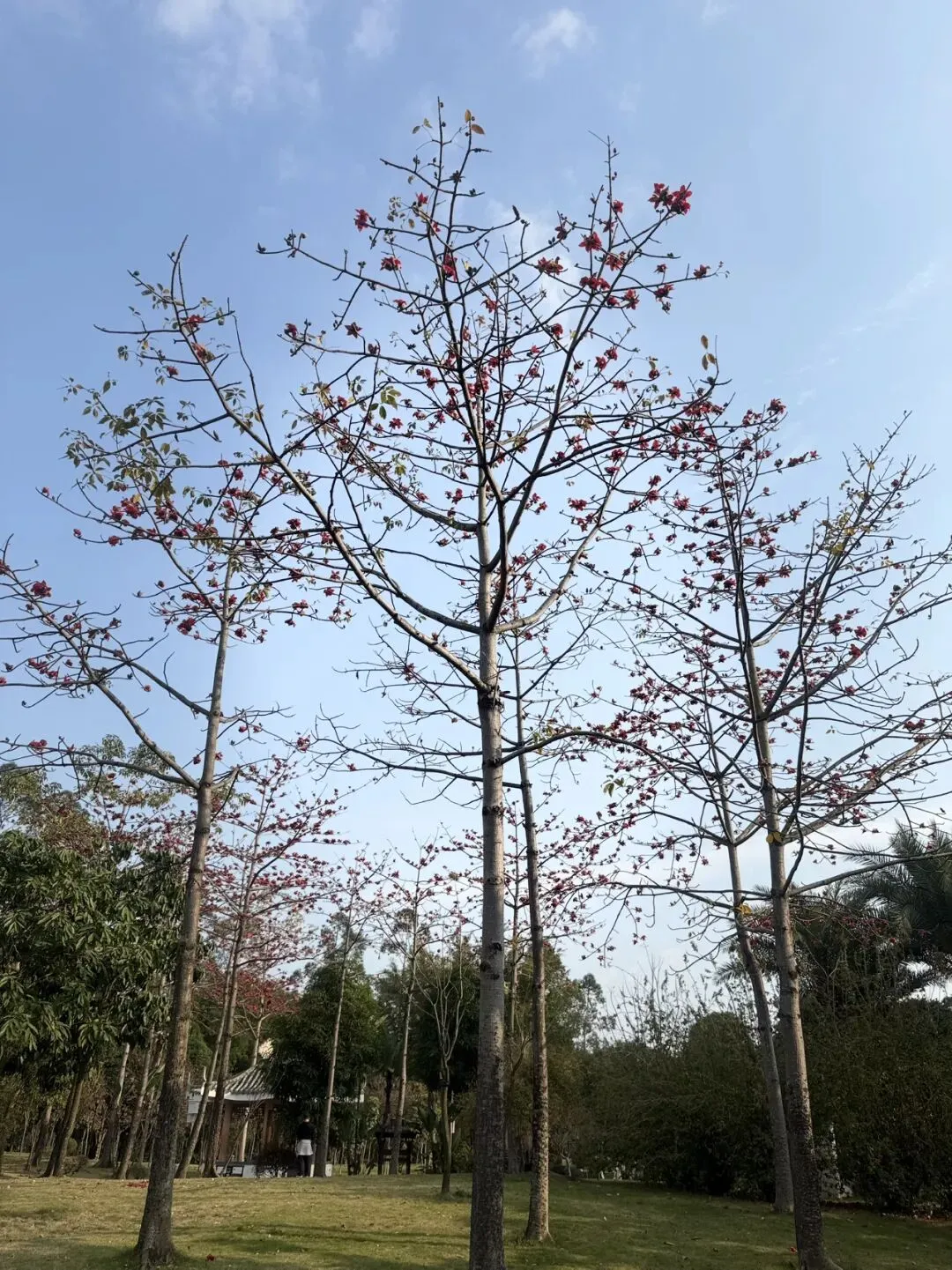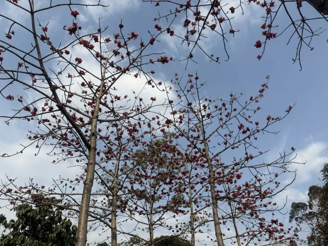 火红大气的花在光秃秃的枝干上一团团一簇簇,木棉花开,花叶不相见,在蓝天白云这块高远清澈的幕布上给人以宁静又热烈的视觉感受。