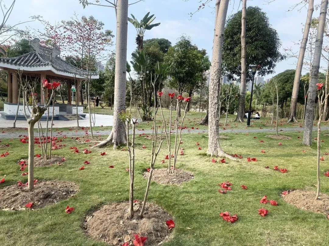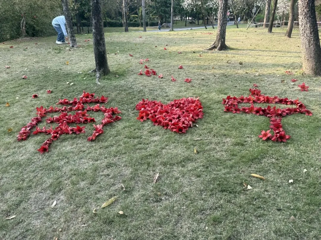 木棉树下,不仅有我,还有温馨的小情侣,拾花的小姐姐,在发芽的草籽,恋爱中的小蚂蚁,呢喃的飞鸟......还有用花拼成图案的陌生人。木棉花期很短,四月,会慢慢长出叶子,不见花。这个周末,你要不要去赴一场木棉花约?