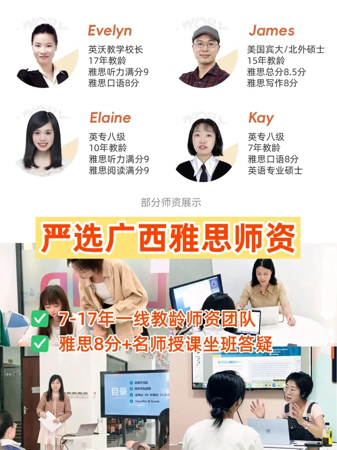 敢签对赌,底气来源于我们顶配的教研团队。作为一家靠口碑立足的南宁雅思机构,英沃汇聚了广西本土7-17年教龄的资深大咖,真正做到“8分名师亲自带学”: