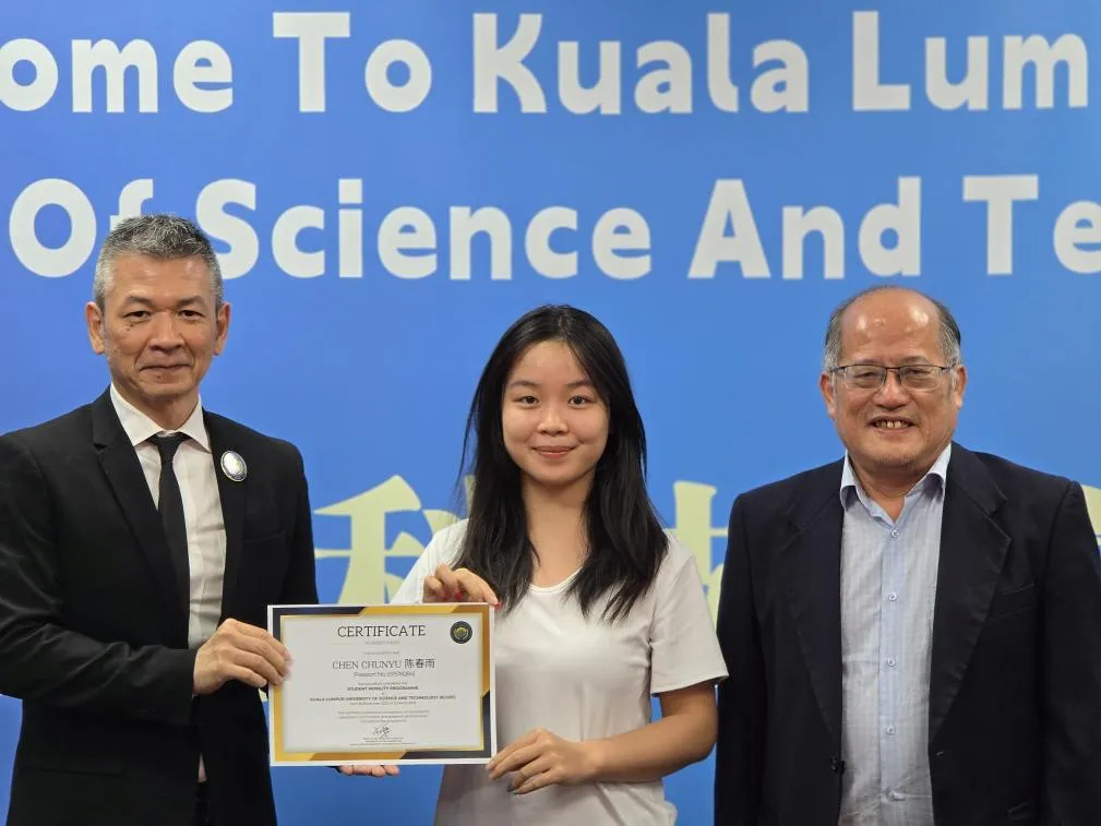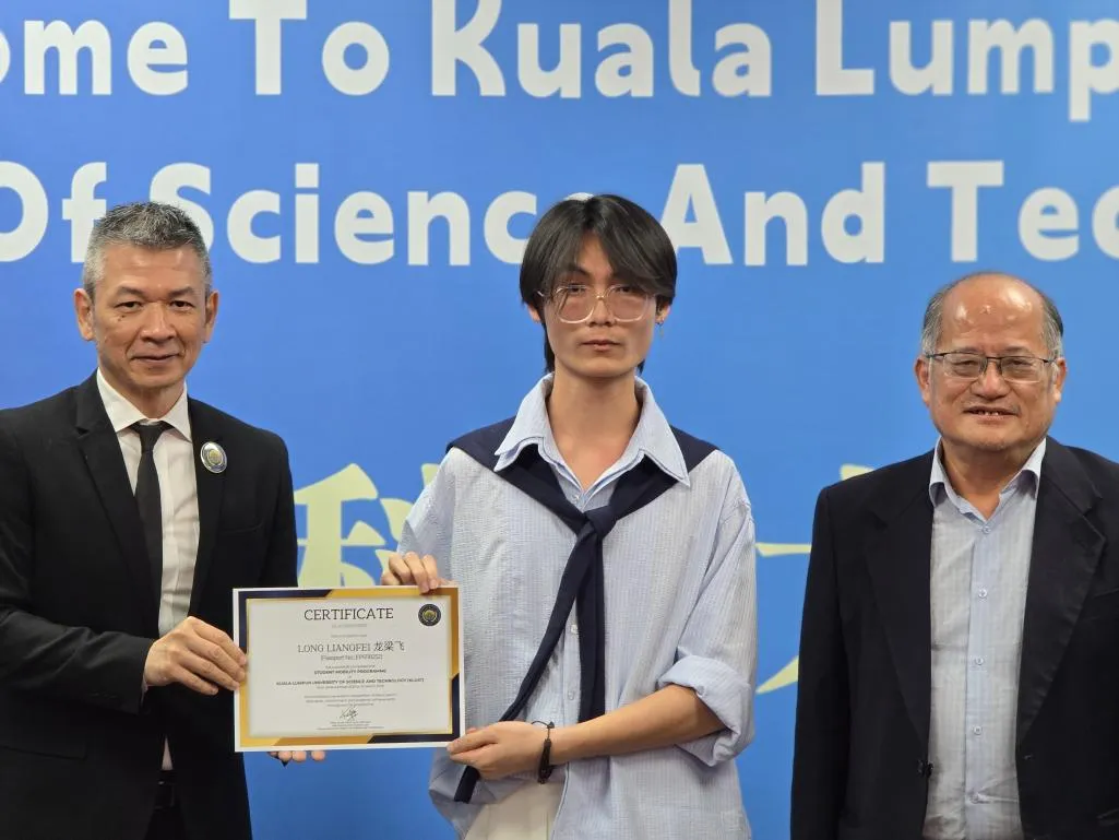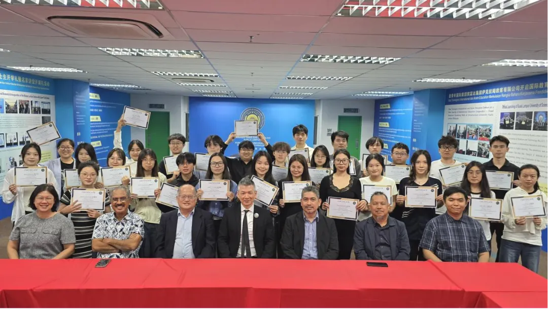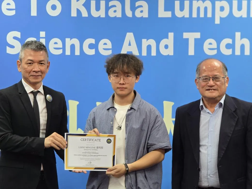 在招生部暨中国运营部总监陈锦松等领导老师的共同见证下,吉隆坡科技大学执行校长吴泽林教授为顺利结业的同学们颁发证书,并向大家表示热烈祝贺。吴泽林教授深情回顾了两校间的合作历程,并对两校间持续深化合作寄予厚望。随后,各专业学生代表分享了各自在马来西亚学习生活的收获与感悟。
