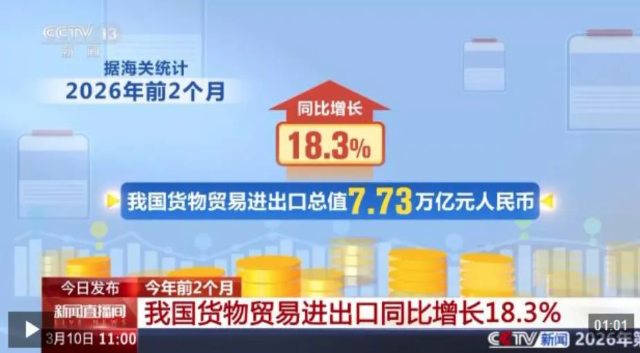 海关总署3月10日发布的数据显示,2026年前2个月,我国货物贸易进出口总值7.73万亿元,同比增长18.3%。