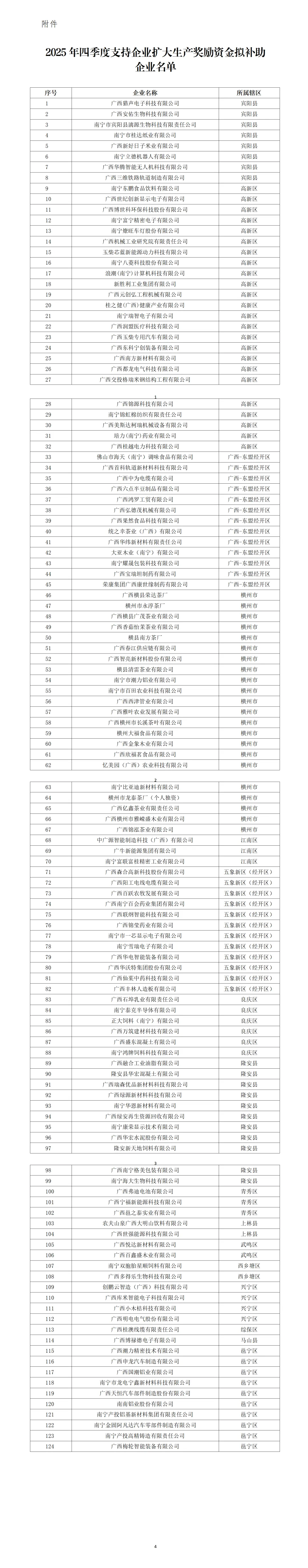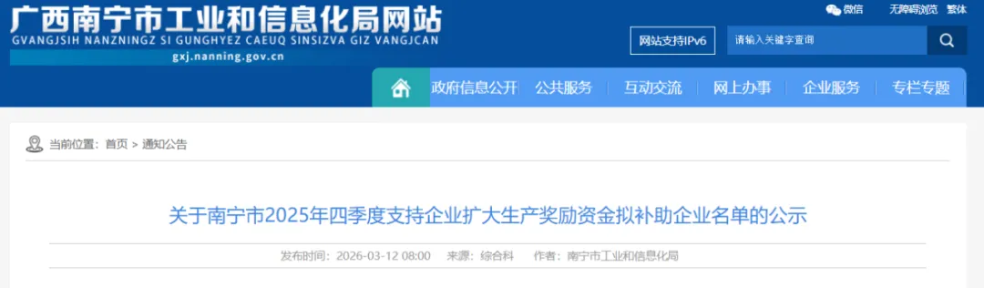 为贯彻落实党中央、自治区、南宁市关于经济工作的决策部署,进一步巩固和增强工业经济稳中向好的态势,根据《南宁市工业和信息化局关于印发2025年下半年支持工业经济稳增长若干措施的通知》(南工信规〔2025〕5号)“鼓励企业稳产扩产”政策措施,经企业申报,各县(市、区)、开发区工信、财政部门审核推荐,南宁市工信局联合市直有关部门审查后,拟认定广西猎声电子科技有限公司等124家企业符合2025年四季度支持企业扩大生产奖励条件,根据工作程序,现将拟奖励企业名单予以公示。