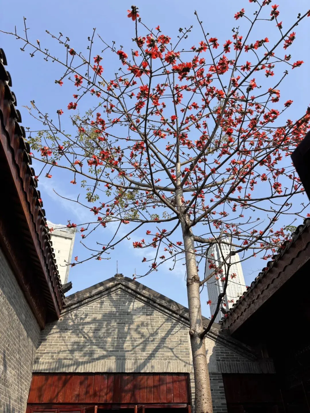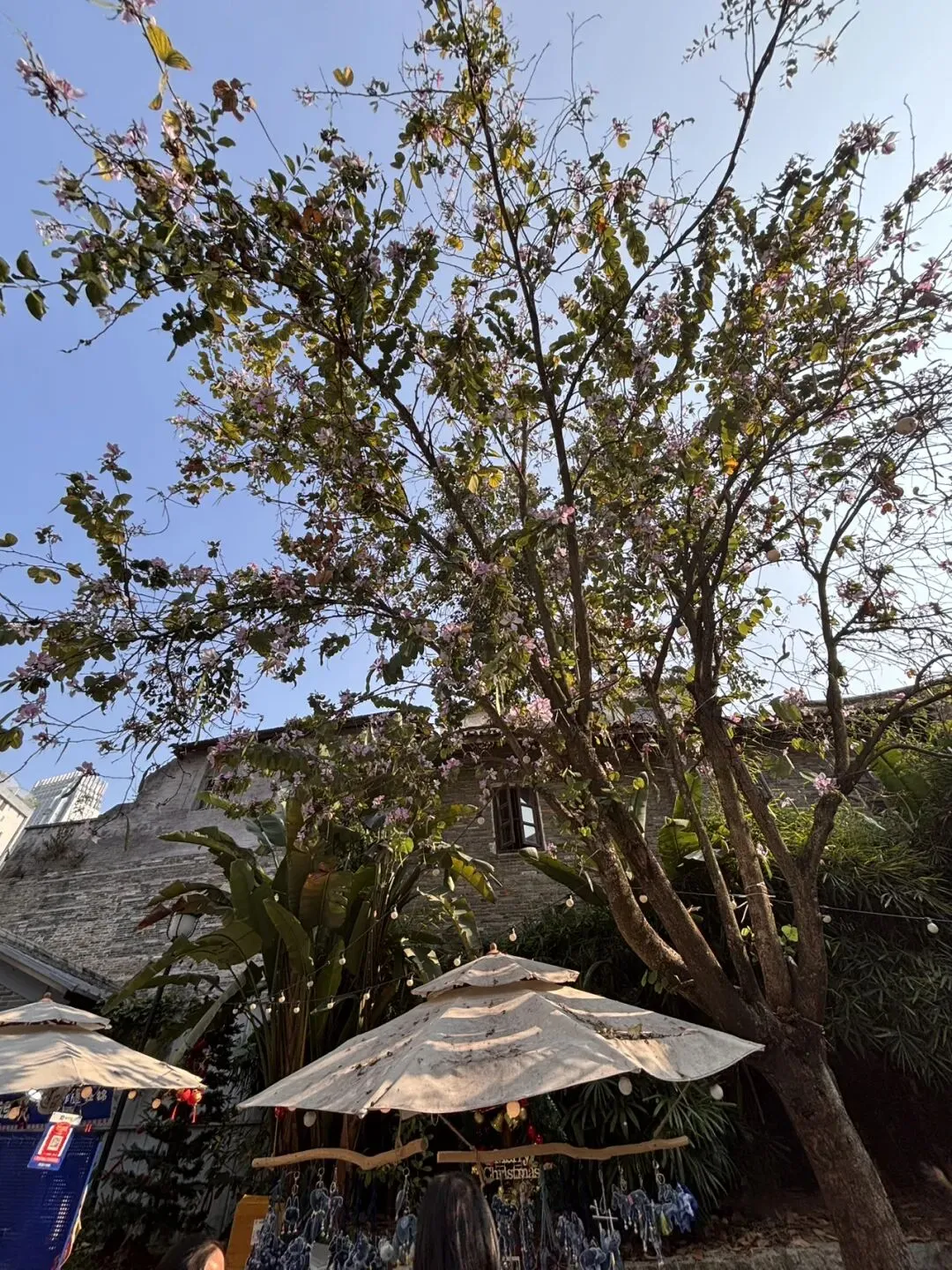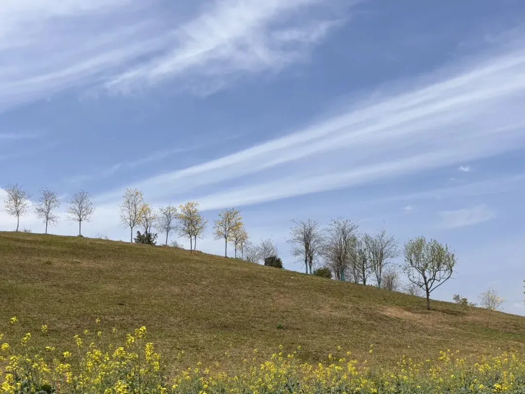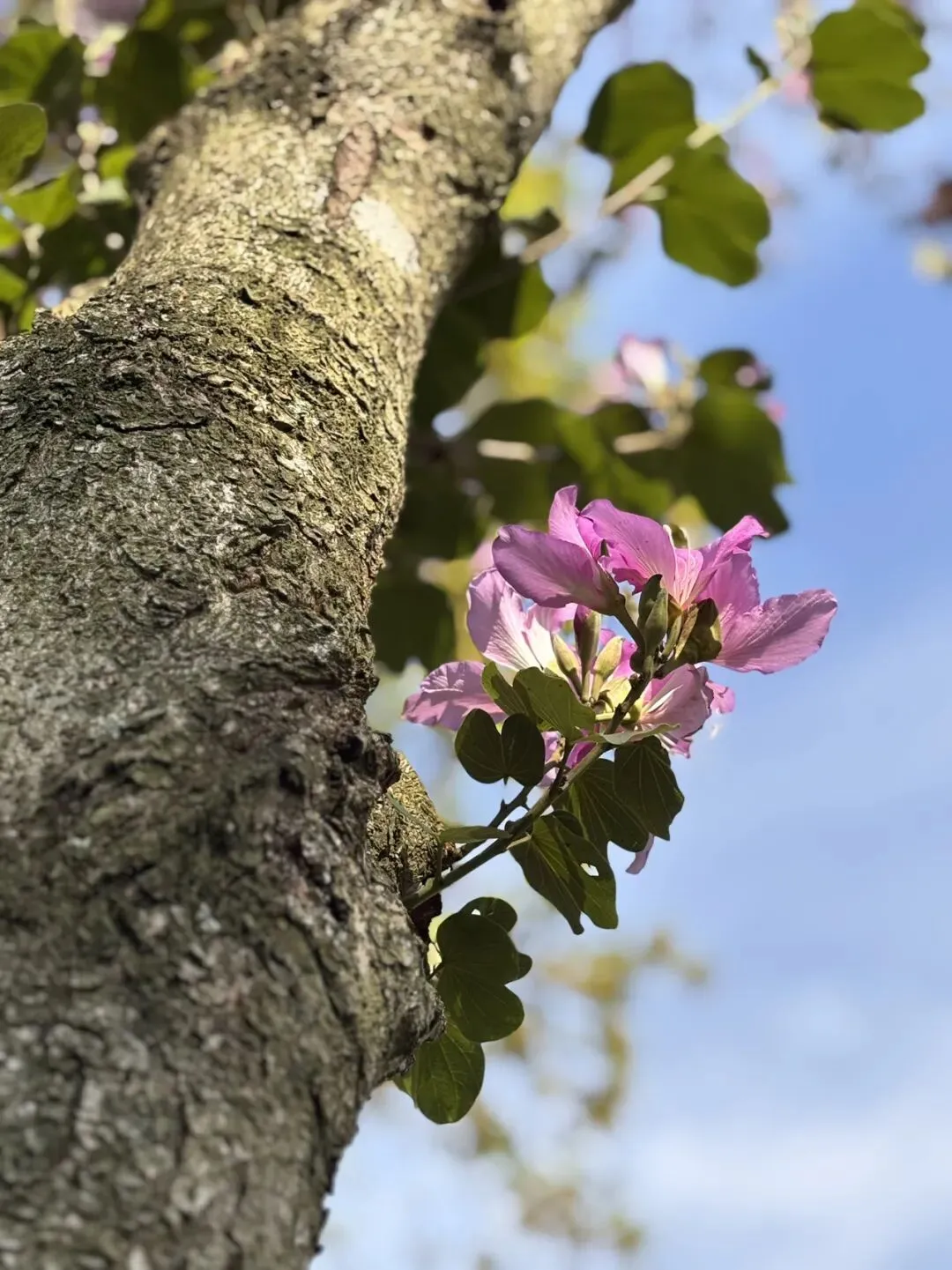 它们开得那样用力,那么认真,蓝天白云都成了背景板。站在树下,仰望花朵,不禁陶醉于它的热烈,它的美丽。这个时候,有句歌词不自觉地窜入脑海“春风它吻上了我的脸”,真真地沉醉了……