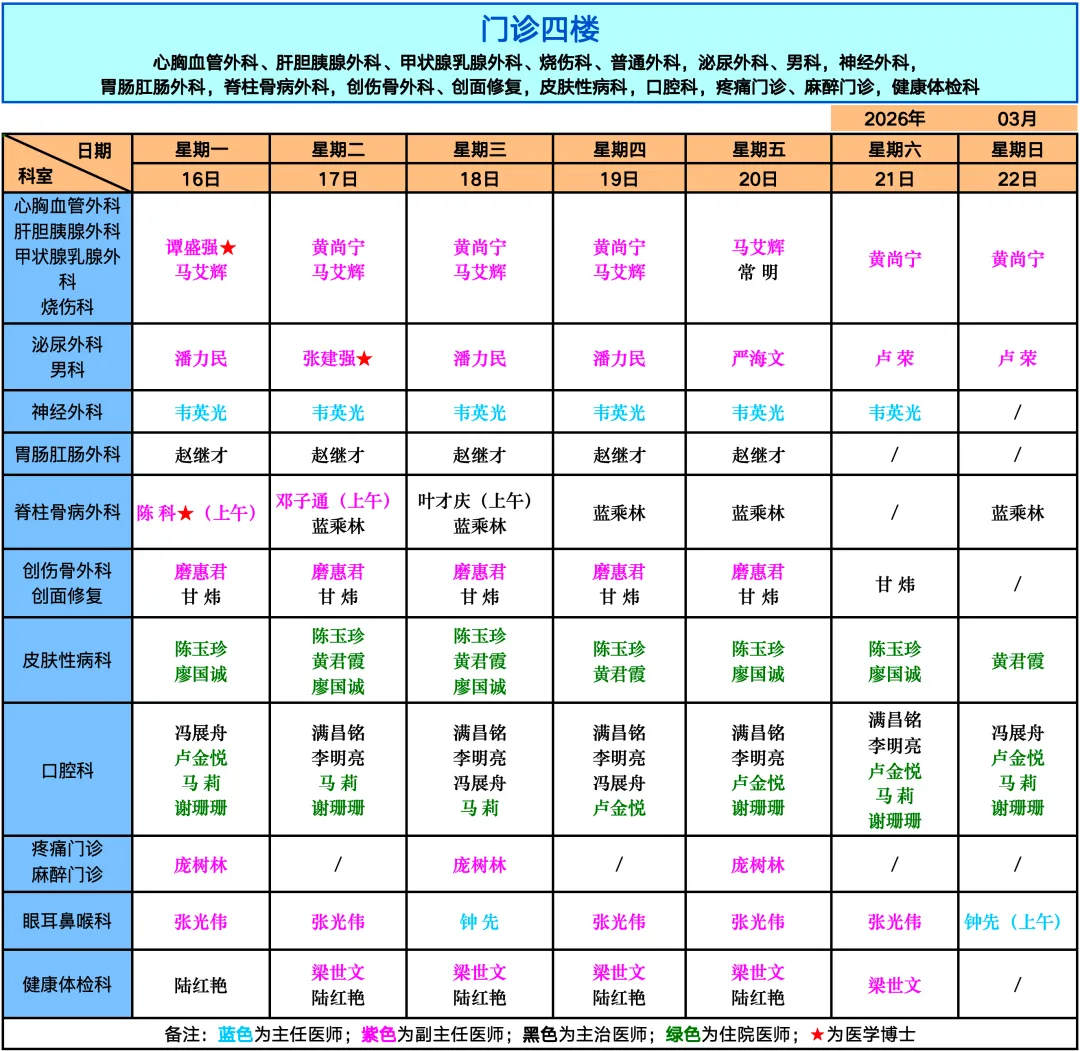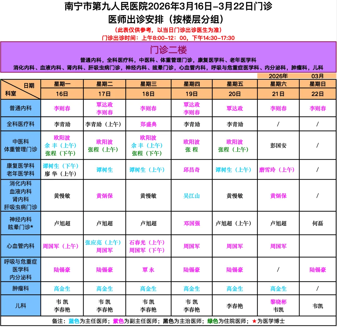 >南宁市第九人民医院门诊医师出诊安排来了(3月16日-3月22日)