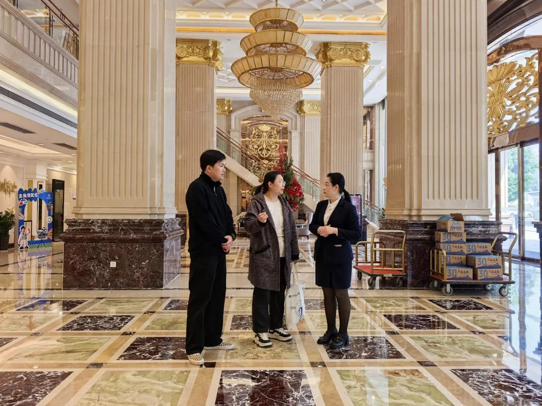 学院领导一行抵达金紫荆国际大酒店,受到了酒店行政人资部负责人甘彩霞的热情接待。在酒店相关人员的陪同下,吴柳蓉一行首先参观了酒店的前厅、餐饮、客房等区域,实地考察了酒店的硬件设施、运营模式及工作环境,对酒店的企业文化、服务标准及岗位设置有了更为直观和深入的了解。