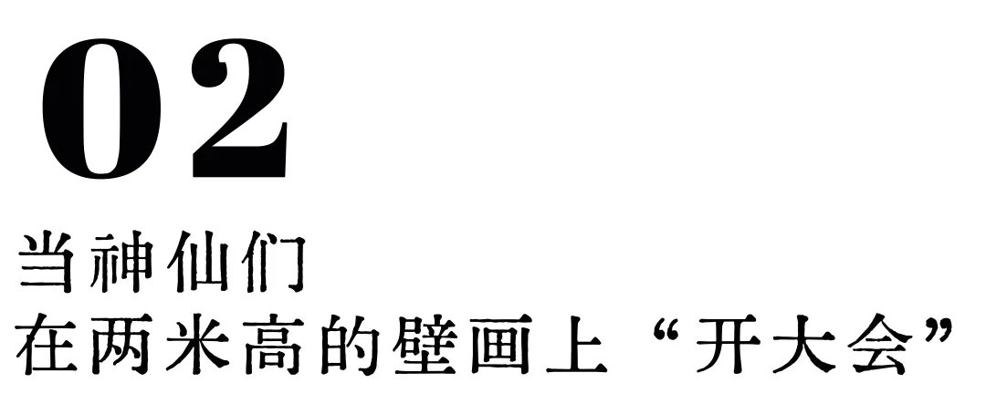 三清塑像正襟危坐,众仙浩荡万方来朝,满壁风动的“神仙大会”即将展开。八大主神,身长3米,顶天立地。簇拥着的群仙也高达2米,她们的面容展现着中土或异域的特点,主宰全世界的日月星辰、雷电风雨。掌管人间一切生老病死、离合悲欢,衣袂翻飞,无风自动。
