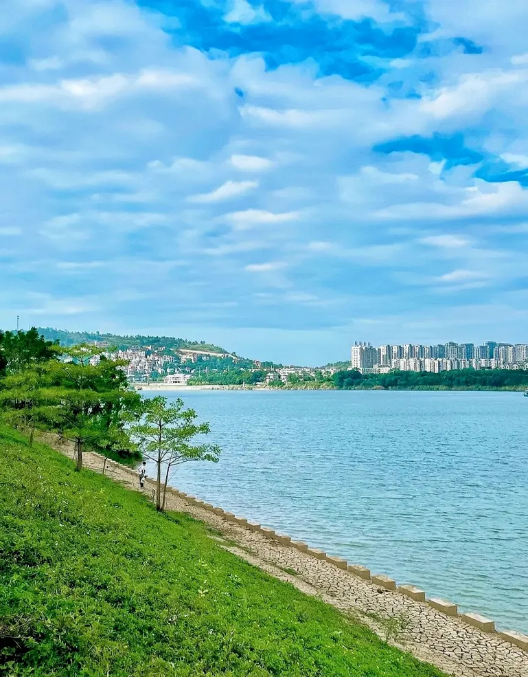 碧水映着蓝天,江风裹着花香