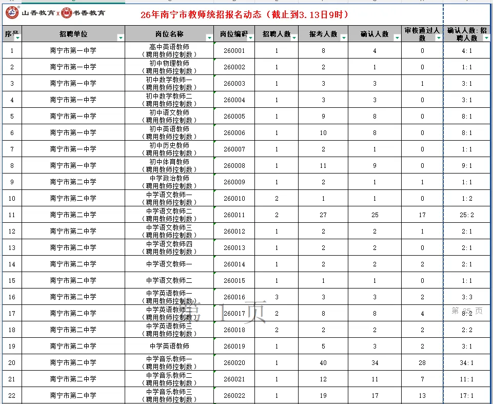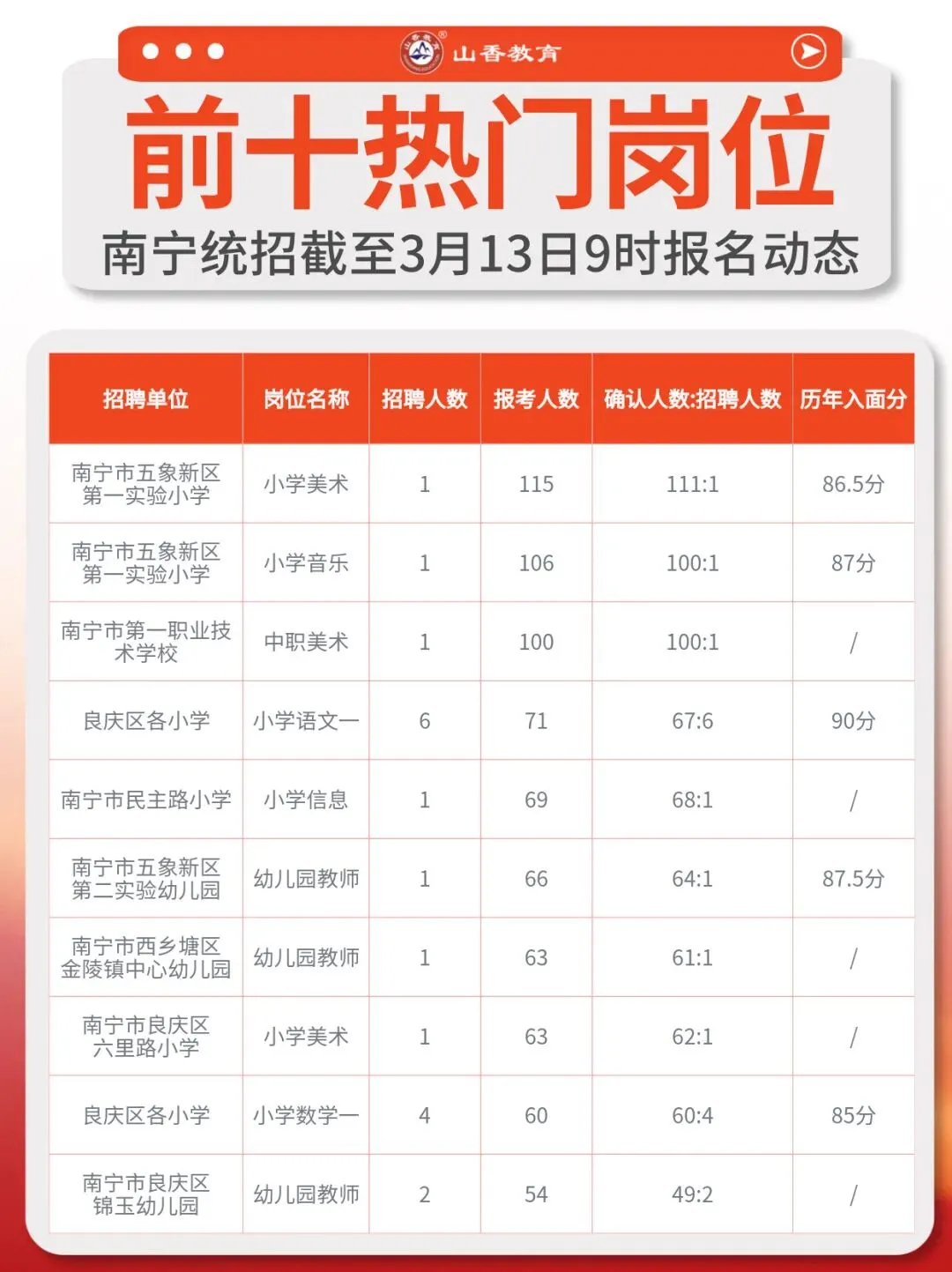 ①南宁市五象新区第一实验小学,小学美术教师(聘用教师控制数),招1人,当前报考人数115人;