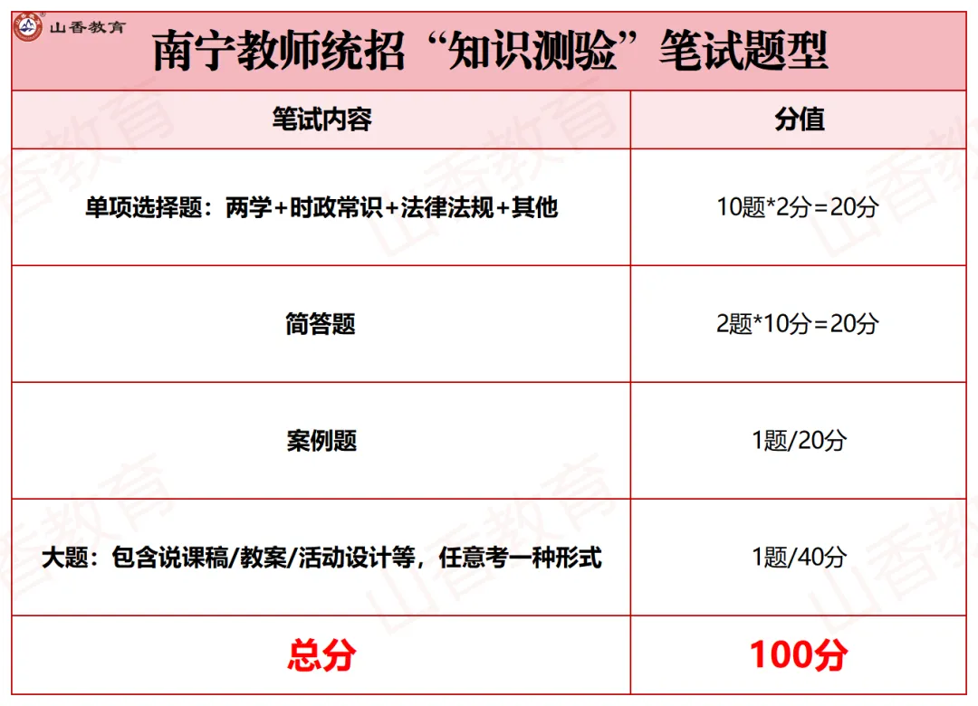 2025 年南宁教师统招笔试内容为:职业道德以及岗位所需的专业知识、技能的掌握和应用能力,综合来说就是“知识测验”。